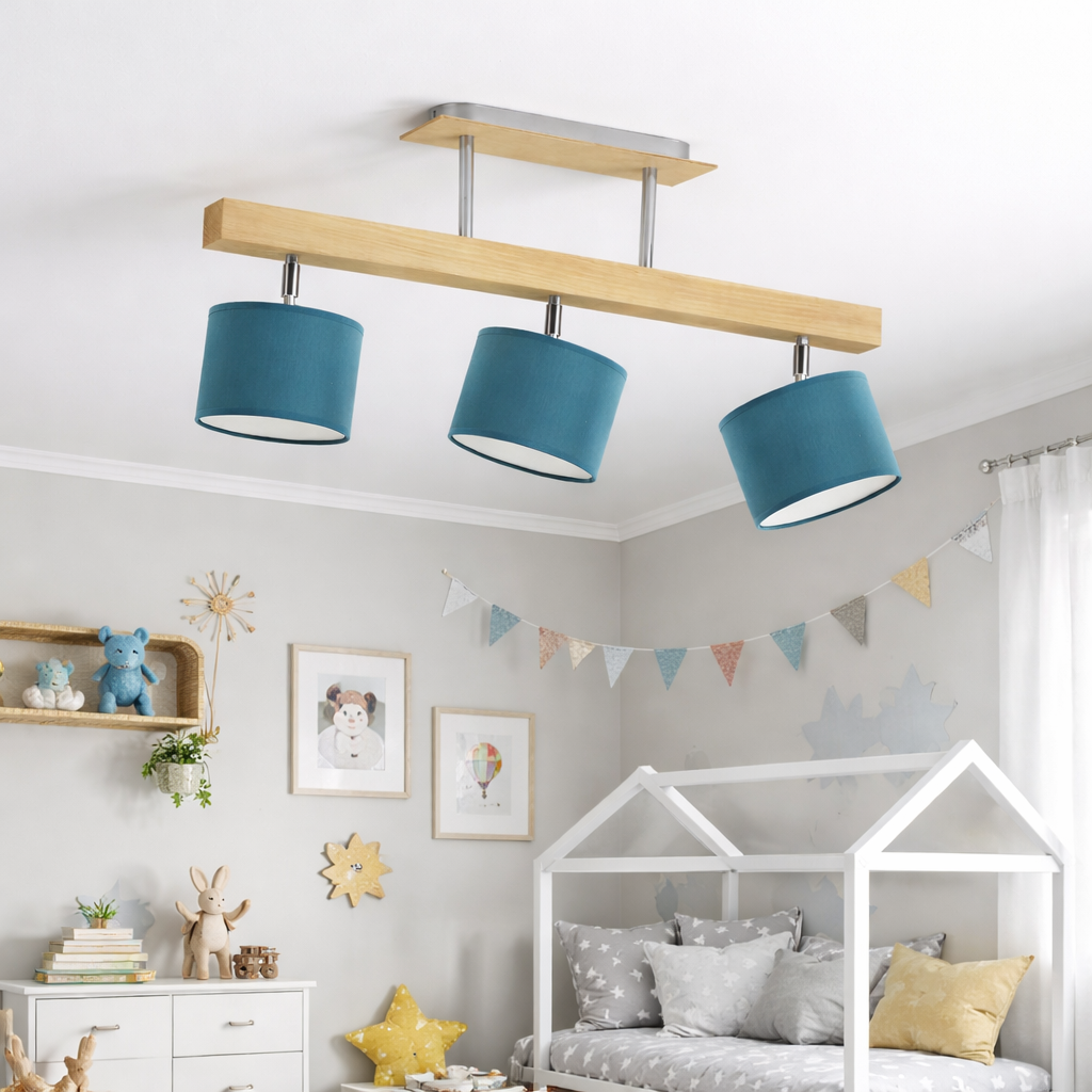 Drewniana lampa sufitowa do pokoju dziecięcego - 3 źródła światła i regulowany kąt padania światła