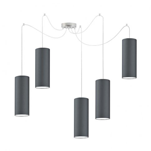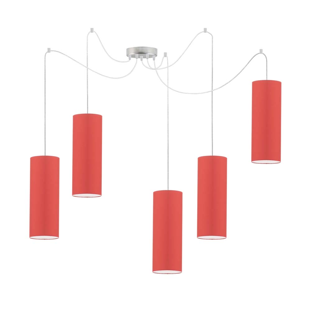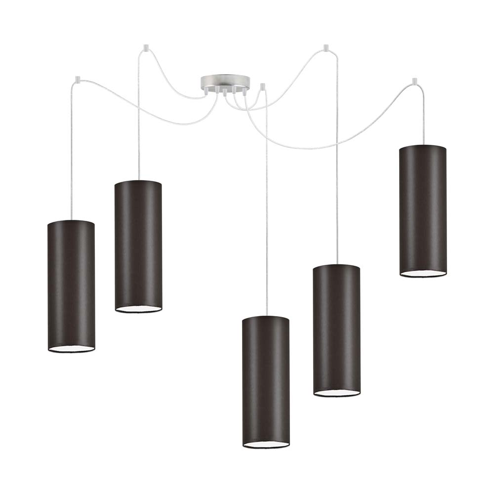 Nowoczesny żyrandol  do salonu składa się z 5 cylindrycznych abażurów w kształcie tuby o średnicy 15 cm i wysokości 35 cm pokrytych znakomitej jakości holenderską tkaniną tekstylną. Kolorystykę kloszy możemy dobierać spośród szerokiej gamy aż 18 wariantów, a stelaże dostępne są w 5 odcieniach. Tak szeroki wachlarz kolorystyczny czyni z 5-punktowej lampy pająk produkt niezwykle uniwersalny, który możesz zastosować w wielu wnętrzach o różnych stylach i przeznaczeniu. W praktycznie każdym pomieszczeniu prezentować się będzie epicko! Lampa posiada połączenie dwuobwodowe i dostosowana jest do źródeł światła o klasach energetycznych od A do G oraz żarówek LED. Posiada miejsce na 5 oprawek o mocy po 60W (każda) mocowanych na tzw. duży gwint E27. Ten elegancki żyrandol dostosowany jest także do energooszczędnych żarówek LED.