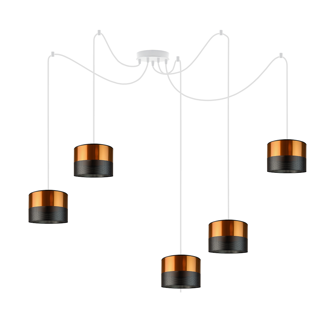 5-punktowa lampa wisząca WAIKIKI W3 GLAM to designerskie oświetlenie sufitowe, które łączy minimalistyczną estetykę z praktycznym zastosowaniem. Jej 5 długich przewodów (do 200 cm), zakończonych eleganckimi, dwukolorowymi abażurami można swobodnie rozmieścić na suficie, dostosowując układ żyrandolu do specyfiki pomieszczenia. Dzięki temu WAIKIKI W5 GLAM sprawdzi się zarówno nad stołem w jadalni, w przestronnym salonie jak i w przytulnej sypialni czy nowoczesnym biurze. Pięc źródeł światła zapewnia skuteczne i równomierne oświetlenie większych przestrzeni, jednocześnie podkreślając charakter wnętrza.