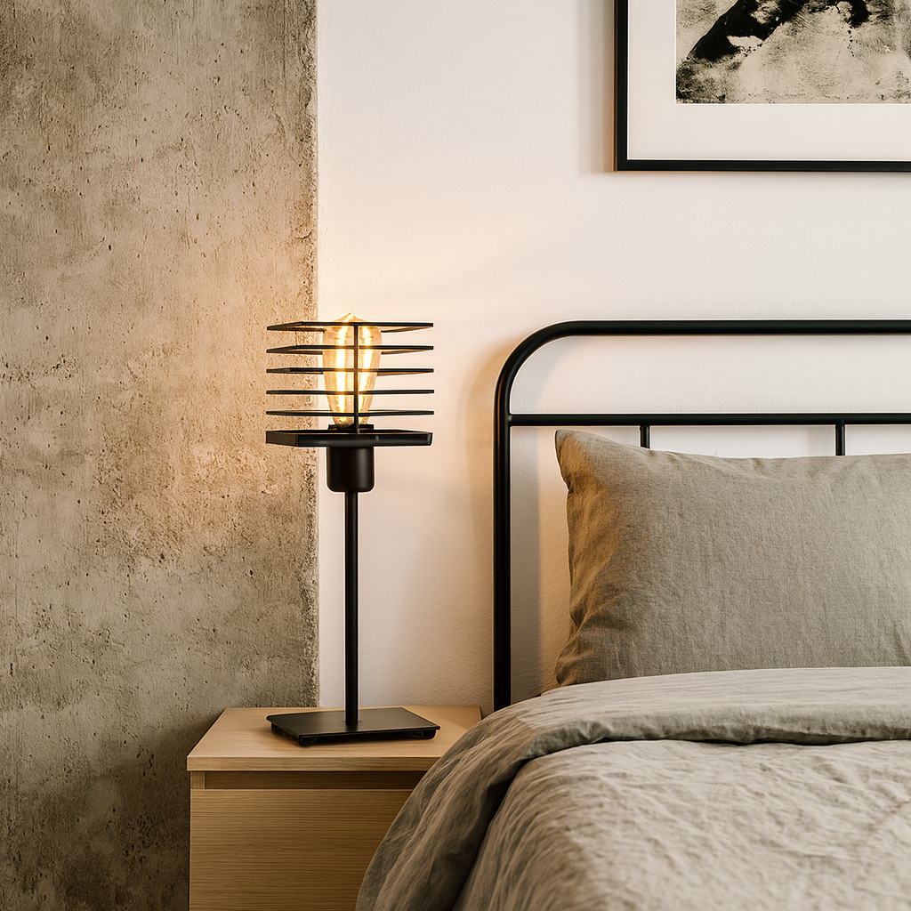 PEGU LOFT to lampka nocna wprost idealna do sypialni wykończonej w stylu loftowym. Kwadratowy abażur składający się z poziomych drucików oraz pionowych łączeń jest doskonałą propozycją dla lubujących się w pięknych ozdobach i funkcjonalnych rozwiązaniach. Model drucianej lampki stołowej wyróżnia się spośród innych opraw niecodzienną i niespotykaną konstrukcją. Klosz, który osłania żarówkę tylko częściowo, sprawdzi się przy czytaniu książek lub wieczornym oglądaniu filmów w sypialni. Ta loftowa lampka nocna to doskonały przykład tego jak przy pomocy jednego elementu, można ożywić surowy wystrój wnętrza, a tym samym nadać mu niepowtarzalnego charakteru.