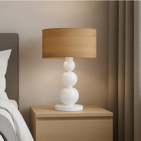 Designerska lampka nocna z abażurem HONOLULU ECO z pewnością spełni Twoje oczekiwania, jeżeli szukasz funkcjonalnego i eleganckiego oświetlenia na stolik nocny w sypialni, komodę w sypialni czy dodatkowe źródło światła do pokoju dziecka. Tak naprawdę tylko od Ciebie zależy w jaki sposób wykorzystasz jej potencjał. Elegancka forma i perfekcyjne wykonanie – to najważniejsze cechy designerskiej lampy stołowej HONOLULU ECO. Uwagę przykuwa konstrukcja oprawy, którą zdobią 3 kule ułożone w kolejności od największej do najmniejszej. Nietuzinkową podstawę lampy wieńczy abażur o średnicy 30 cm strukturą imitujący naturalne drewniane słoje. Cylindryczny klosz à la fornir zapewnia odpowiednie rozproszenie światła, idealne do czytania czy pracy przy komputerze. Biała lampa stołowa z kloszem w kolorze dąb sonoma o wysokości 41 cm i szerokości 30 cm jest doskonałym rozwiązaniem zarówno dla większych, jak i mniejszych mebli. Jej smukła forma i kompaktowe wymiary sprawiają, że idealnie sprawdzi się na powierzchniach, gdzie potrzebujesz dodatkowego oświetlenia.