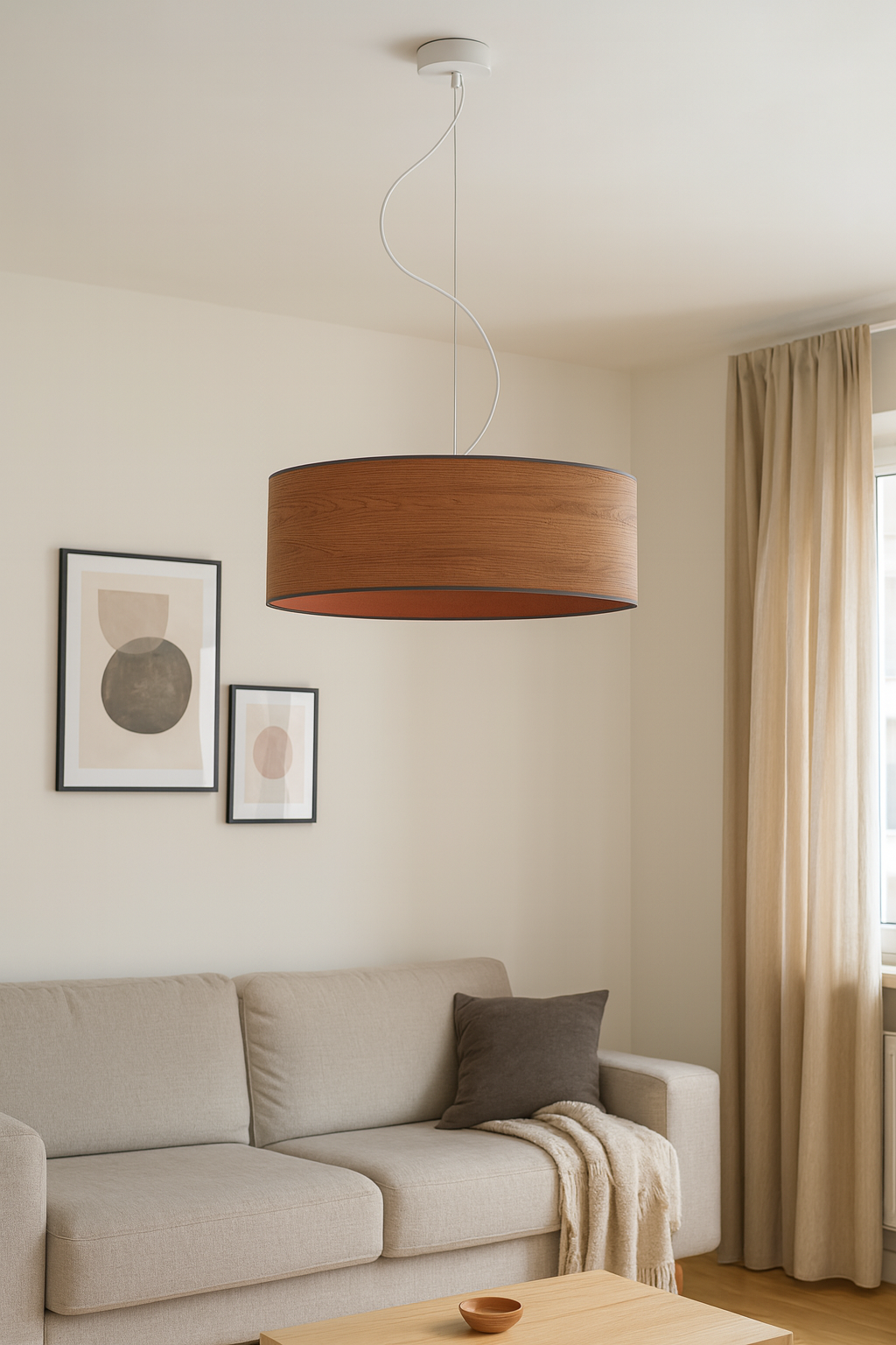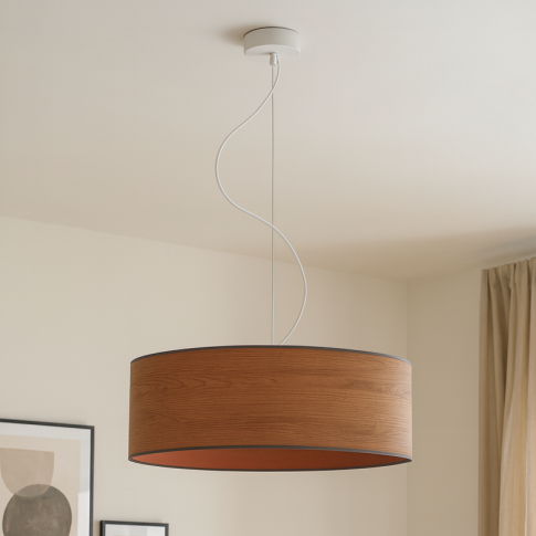 Lampa wisząca z abażurem o średnicy 50 cm HAJFA ECO z oferty sklepu LYSNE.PL to idealne połączenie stylu skandynawskiego, nowoczesnego designu i funkcjonalnego oświetlenia. Jej abażur z tworzywa PVC o strukturze drewna (à la fornir) zachwyca naturalnym wyglądem, wpisując się w aktualne trendy eko w aranżacji wnętrz. Ten efektowny żyrandol do salonu to wybór dla osób ceniących prostotę, harmonię i przytulny klimat w domu. Designerska lampa wisząca doskonale sprawdzi się jako oświetlenie do salonu, kuchni i sypialni wprowadzając do wnętrza ciepłe, miękkie światło oraz przyjemną atmosferę.