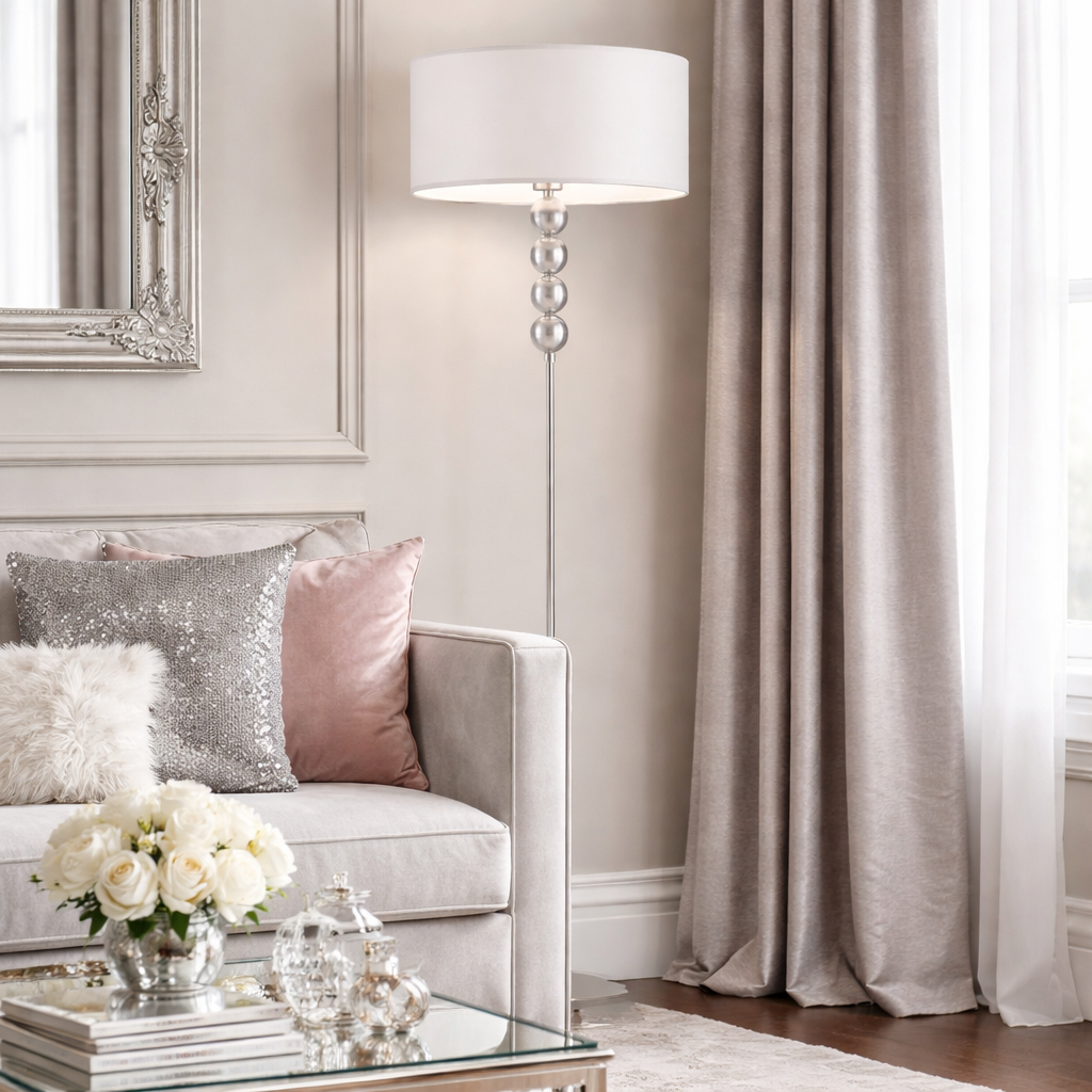 Wydaje Ci się, że nowoczesna, minimalistyczna lampa nie może mieć ozdobnych elementów? Nic bardziej mylnego! Biała lampa stojąca z dekoracyjnymi kulami BERMUDY to dowód na to, że z połączenia powściągliwego designu z klasycznymi i dekoracyjnymi dodatkami może powstać harmonijny projekt, który doskonale pasuje do wielu aranżacji. Pomieszczenia w stylu glamour, dziecięce, przytulne pokoje, a może nowoczesne salony? BERMUDY sprawdzi się wszędzie tam, gdzie potrzebujesz dodatkowego, designerskiego oświetlenia i przytulnej atmosfery.