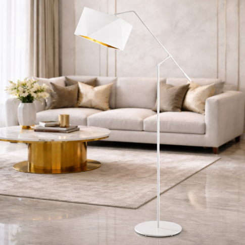 Biała lampa podłogowa do salonu w stylu glamour COLMA GOLD z regulowaną głowicą