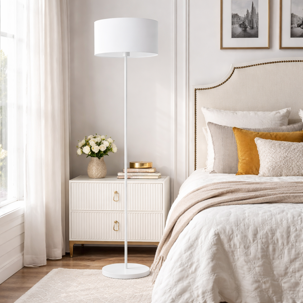 Minimalistyczna lampa podłogowa z abażurem WERONA jest wspaniałą propozycją dla wielbicieli klasycznego designu. Jej klasyczna forma sprawia, że świetnie uzupełnia nowoczesne lub minimalistyczne wnętrze. Idealnie sprawdzi się także w kąciku przeznaczonym do czytania lub po prostu jako element typowo dekoracyjny. Abażurowa lampa podłogowa jest wyposażona we włącznik nożny, która znakomicie ułatwia codzienne funkcjonowanie. Włącznik umiejscowiony jest przy przewodzie zasilającym. Stelaż lampy stojącej wykonany jest z metalu, natomiast abażur to najwyższej jakości holenderska tkanina tekstylna podklejona folią PVC.