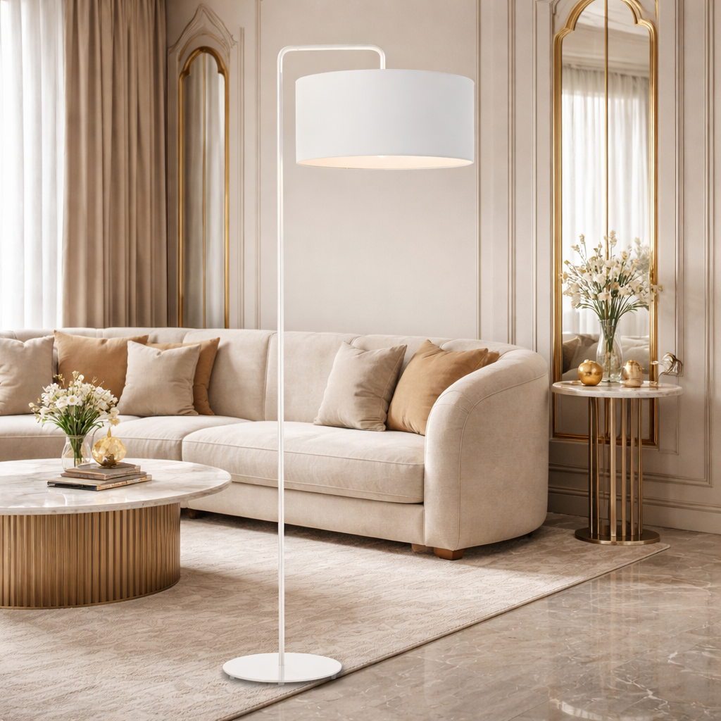 Biała lampa stojąca do salonu BOLIVIA lampa stojąca z abażurem 40 cm do dużego salonu