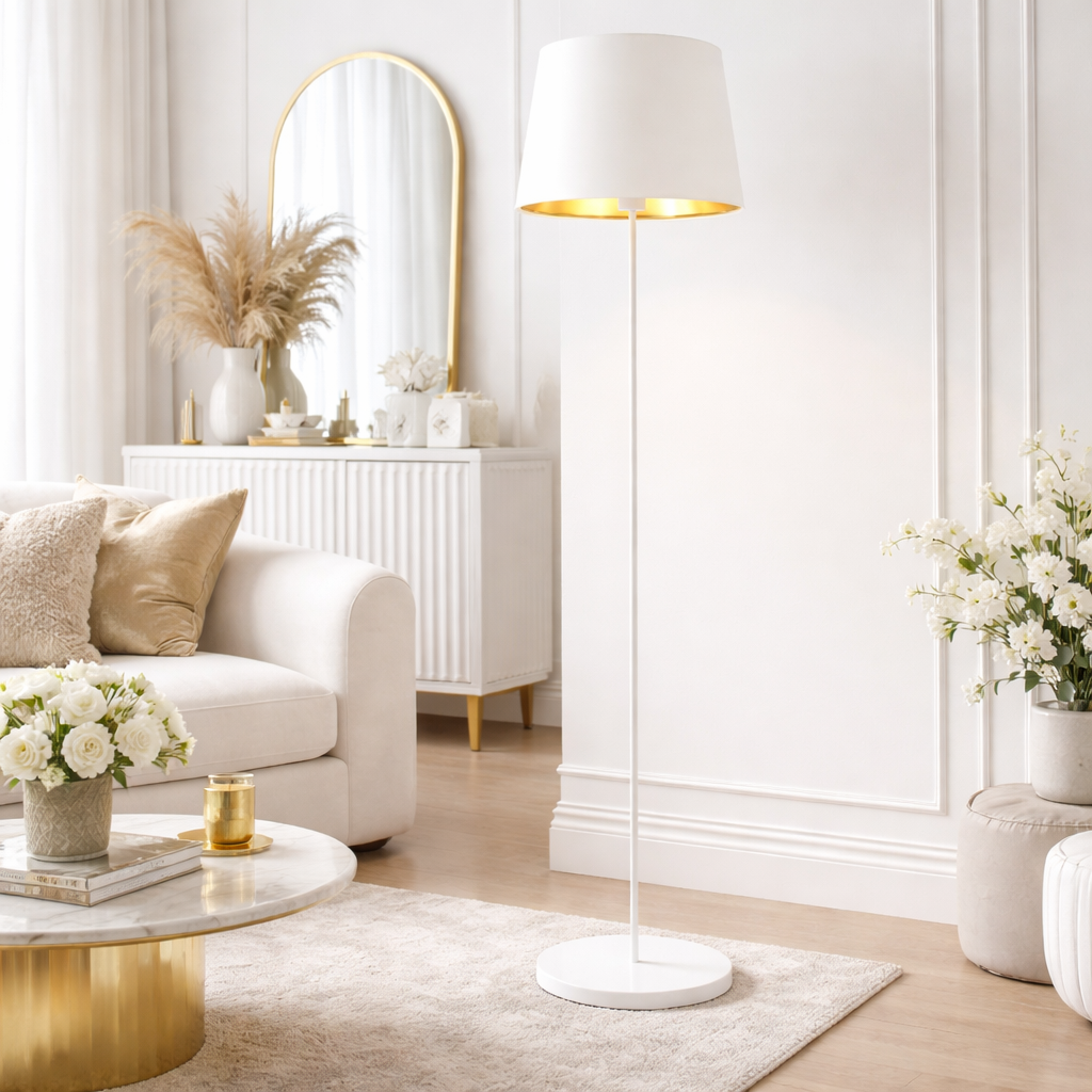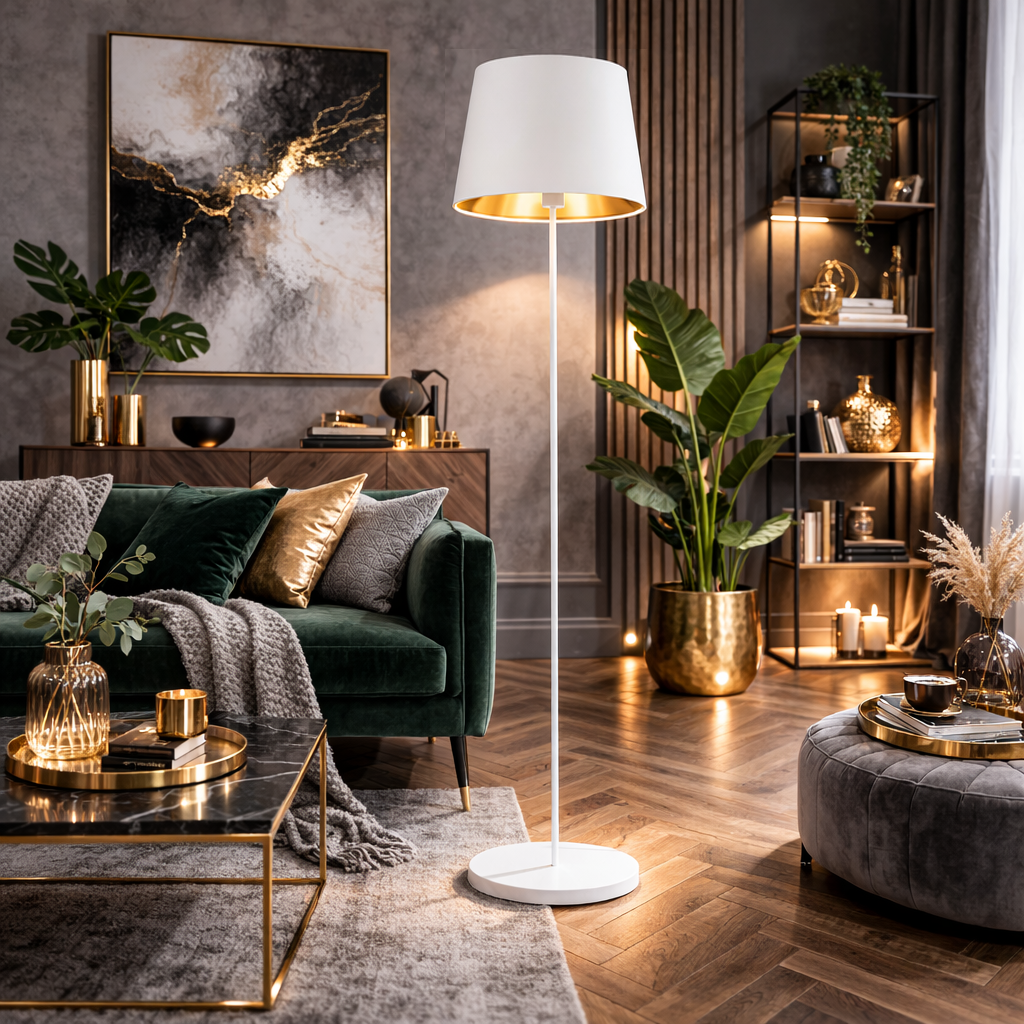 Kluczowym elementem lampy stojące do salonu VASTO GOLD jest jej wyjątkowy abażur o wymiarach 28 cm wysokości, 28 cm szerokości (górna średnica) i 37 cm (dolna średnica), który w zależności od wybranego wariantu kolorystycznego posiada różne właściwości. W białej wersji wnętrze abażura zostało wykończone lśniącym złotem, które odbija światło, dodając przestrzeni eleganckiego blasku. W czarnej opcji, wnętrze klosza jest złote, jednak jego powierzchnia pozostaje matowa, co daje efekt ciepłego, stonowanego oświetlenia idealnie wpasowującego się w klimatyczne, nowoczesne wnętrza. VASTO GOLD to designerska lampa podłogowa, która nie tylko spełnia swoją funkcję praktyczną, ale staje się również stylowym elementem dekoracyjnym. Aby dopasować lampę stojącą z abażurem VASTO GOLD do swojego wnętrza, oferujemy szeroki wybór kolorów abażurów i stelaży. Do wyboru jest pięć wariantów abażurów: biały ze złotym wnętrzem (złoty połysk), szary stalowy ze złotym wnętrzem (złoty mat), zieleń butelkowa ze złotym wnętrzem (złoty mat), granatowy ze złotym wnętrzem (złoty mat) oraz czarny ze złotym wnętrzem (złoty mat). Wszystkie te opcje pozwalają na stworzenie spersonalizowanej lampy, która będzie doskonale współgrać z pozostałymi elementami wnętrza.