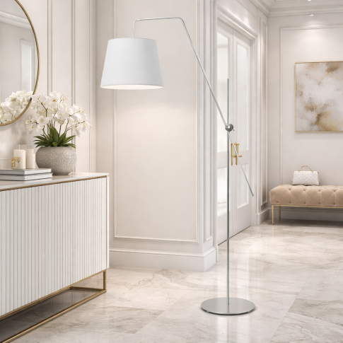 Biała lampa stojąca z regulowanym ramieniem VIGO – nowocześnie i z klasą