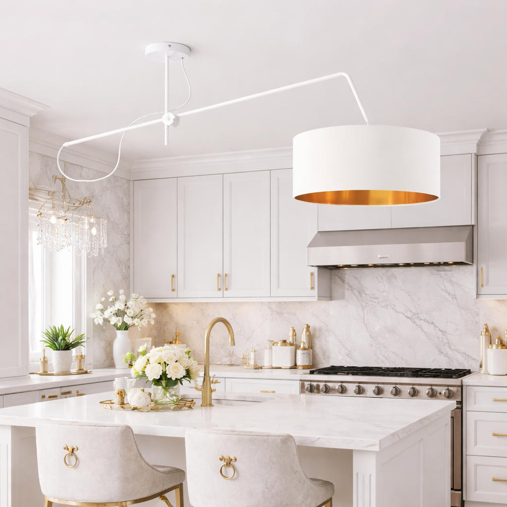 Optymalna odległość lampy od blatu stołu to zazwyczaj 60–90 cm. Model RIO GOLD dzięki regulacji ramienia pozwala łatwo ustawić odpowiednią wysokość, tak aby światło było komfortowe dla domowników i nie oślepiało podczas posiłków. Możliwość zmiany kąta padania światła sprawia też, że lampa dobrze sprawdza się w roli oświetlenia zadaniowego, np. do czytania lub pracy przy stole.