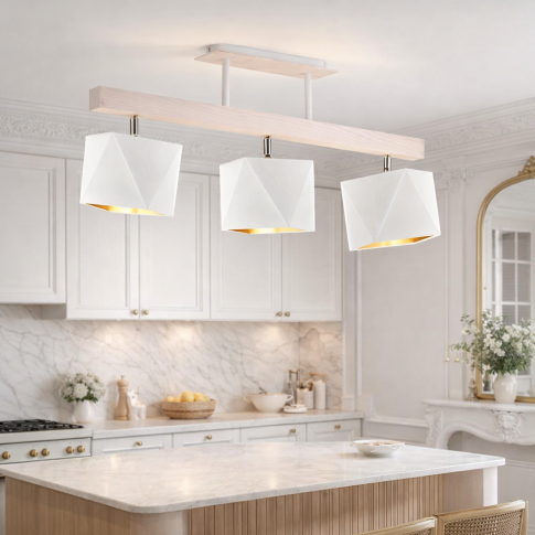 Biała lampa sufitowa z regulowanymi kloszami MIRAMAR GOLD to połączenie naturalnych materiałów i nowoczesnego designu, dzięki czemu doskonale wpisuje się zarówno w aranżacje skandynawskie jak i loftowe czy nowoczesne wnętrza. Konstrukcja lampy wykonana została z elementów drewna sosnowego, które nadają jej naturalny charakter, natomiast abażury z wysokiej jakości holenderskiej tkaniny tekstylnej podklejonej złotą folią PVC zapewniają elegancki efekt świetlny. Złote wnętrze abażura odbija światło, dzięki czemu lampa sufitowa z drewnem i złotym abażurem rozświetla pomieszczenie ciepłym i przyjemnym blaskiem. Dzięki wymiarom 40 cm wysokości oraz 75 cm szerokości jest to idealna nowoczesna lampa sufitowa do salonu, sypialni lub jadalni, która łączy funkcjonalność z dekoracyjnym charakterem.