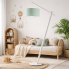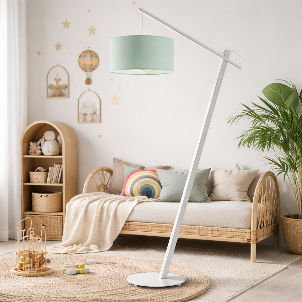 Biało-miętowa lampa podłogowa z tkaninowym abażurem TORINO do pokoju dziecięcego