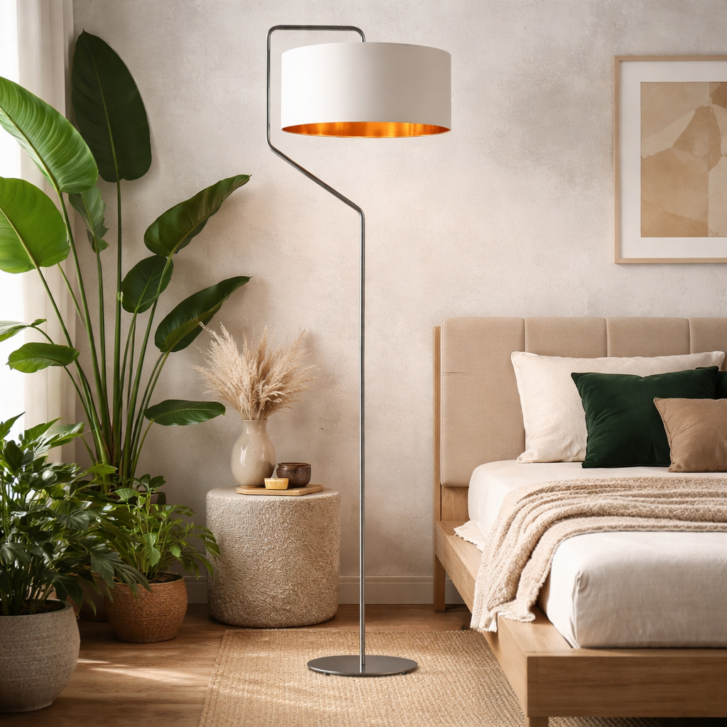 TESALLIA GOLD to idealna lampa podłogowa do salonu, sypialni czy gabinetu, która może pełnić funkcję zarówno głównego źródła światła jak i stylowego akcentu dekoracyjnego. Jako abażurowa lampa podłogowa wyróżnia się nie tylko eleganckim designem, ale również praktycznym zastosowaniem, które sprawia, że jest idealnym wyborem do każdego pomieszczenia. W salonie lampa stojąca z abażurem stanie się centralnym punktem przyciągając wzrok swoim wyjątkowym stylem i tworząc przytulną atmosferę sprzyjającą relaksowi. Złote wnętrze klosza subtelnie rozprasza światło, wypełniając przestrzeń ciepłym, delikatnym, złotym blaskiem, który doskonale podkreśla charakter wnętrza. Jako lampa stojąca do sypialni TESALLIA GOLD wniesie do pomieszczenia niepowtarzalny klimat, który sprzyja wyciszeniu i odpoczynkowi. Lampa podłogowa ze złotymi elementami stworzy miękkie, przyjemne światło, idealne do wieczornego relaksu, jednocześnie dodając elegancji i wyrafinowania. Komfortu użytkowania dodaje włącznik nożny umieszczony na przewodzie zasilającym.