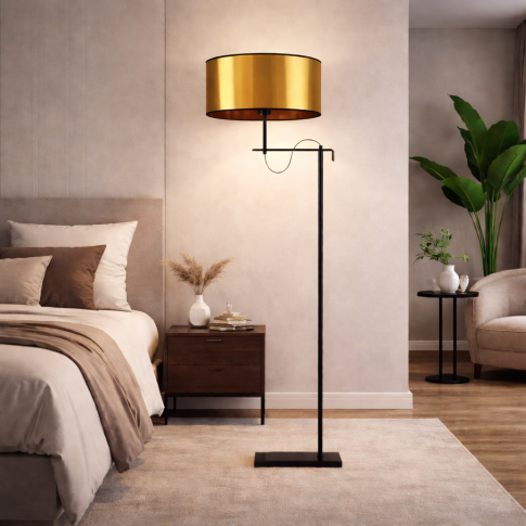 Czarna lampa stojąca ze złotym abażurem doskonale sprawdzi się w nowoczesnych, industrialnych i loftowych wnętrzach, gdzie kontrastujące materiały i metaliczne akcenty są kluczowe. Dzięki połączeniu eleganckiej czerni z ciepłym, złotym wykończeniem idealnie wpisze się w surowe, przemysłowe przestrzenie, takie jak salon, gabinet czy przestronna jadalnia, nadając im wyrazistego charakteru. Tego typu stojąca lampa podłogowa może być również świetnym akcentem w bardziej klasycznych aranżacjach w których metaliczne detale dodają nuty nowoczesności i luksusu. Ponadto jej stonowana kolorystyka i elegancki design sprawiają, że będzie także odpowiednia w eleganckich biurach, sypialniach urządzonych w stylu glamour, a nawet w stylu eklektycznym, gdzie różne estetyki się przenikają.