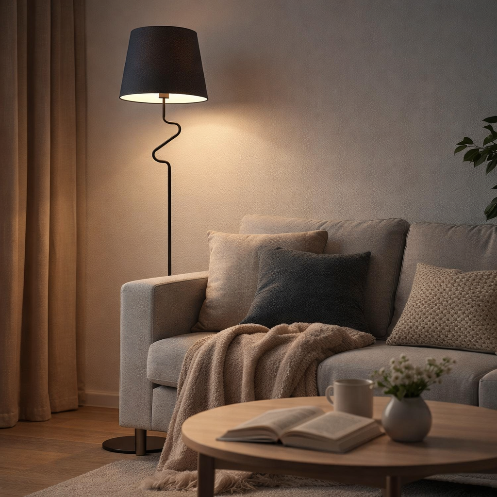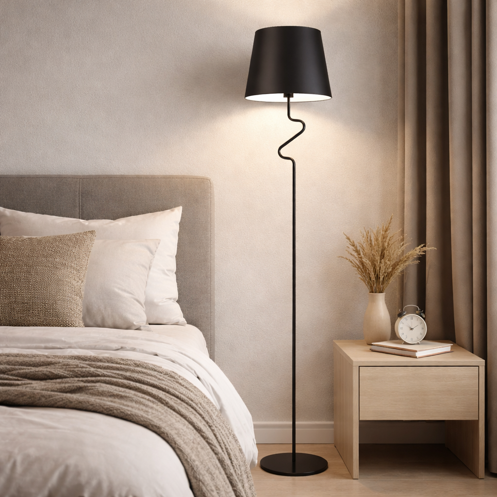 Funkcjonalna i elegancka lampa stojąca z czarnym abażurem