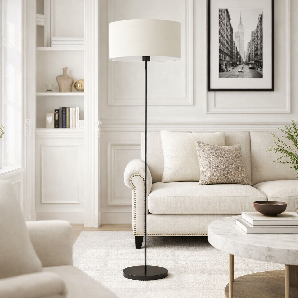 Czarna lampa podłogowa do salonu z kremowym abażurem WERONA w minimalistycznym stylu
