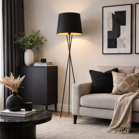 Lampa podłogowa na 3 nogach TOKIO GOLD jest doskonałym dodatkiem do wielu wnętrz, dodając niepowtarzalnego uroku i stylu. Złote wykończenie klosza pozwala na umieszczenie tego modelu w towarzystwie takich struktur jak beton, szkło czy marmur. W salonie lampa na trójnogu stanie się nowoczesnym akcentem, wprowadzając przyjemną atmosferę do tego pomieszczenia. W sypialni stworzy relaksujące miejsce do odpoczynku czy wieczornego czytania. W biurze zaś, zapewni odpowiednie oświetlenie do pracy, dodając zarazem elegancji i charakteru. Oryginalna lampa podłogowa na trójnogu sprawdzi się najlepiej we wnętrzach nowoczesnych, minimalistycznych i awangardowych, podkreślając ich wyjątkowy charakter. Wyrazisty design TOKIO doskonale harmonizuje z nowoczesnymi przestrzeniami, nadając im unikalnego charakteru. Czarna lampa stojąca z abażurem to bez wątpienia subtelna dekoracja i idealne oświetlenie dla osób ceniących pomieszczenia w estetycznej i schludnej aranżacji z nutą funkcjonalności ale i charakteru.