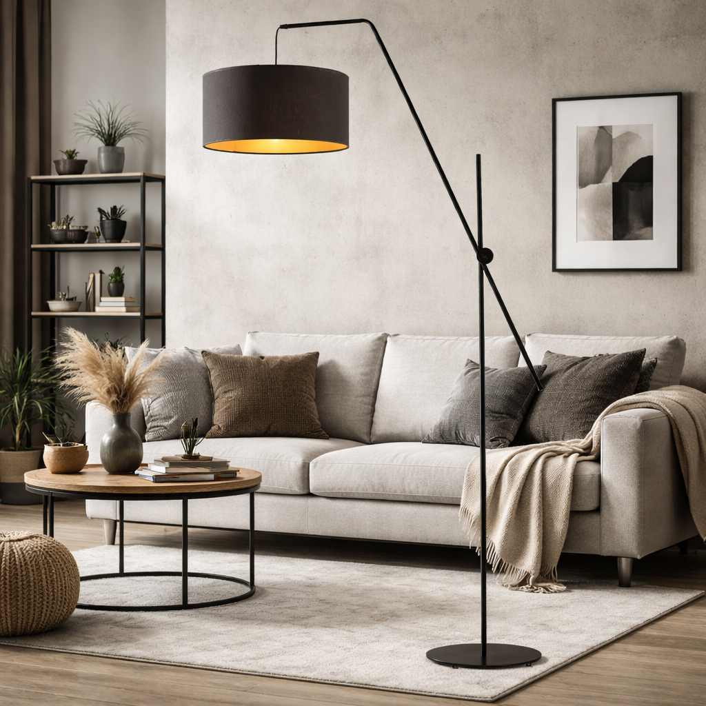 Lampa stojąca z czarnym abażurem ze złotym wnętrzem BILBAO GOLD to wyjątkowa propozycja dla osób, które cenią nowoczesność i funkcjonalność w jednym. Dzięki ruchomemu ramieniu, lampa wyróżnia się spośród innych modeli, umożliwiając precyzyjne ukierunkowanie światła. To rozwiązanie sprawia, że lampy podłogowe z regulowanym ramieniem doskonale sprawdzają się w każdym wnętrzu, oferując elastyczność, którą trudno znaleźć w klasycznych modelach. Abażury w kolekcji GOLD posiadają złote wnętrze – w wersji białej z połyskującą powierzchnią, a w innych kolorach (czarny, szary, granatowy, zieleń butelkowa) z matowym wykończeniem. To połączenie funkcjonalności i elegancji, które doda wnętrzu niepowtarzalnego charakteru.
