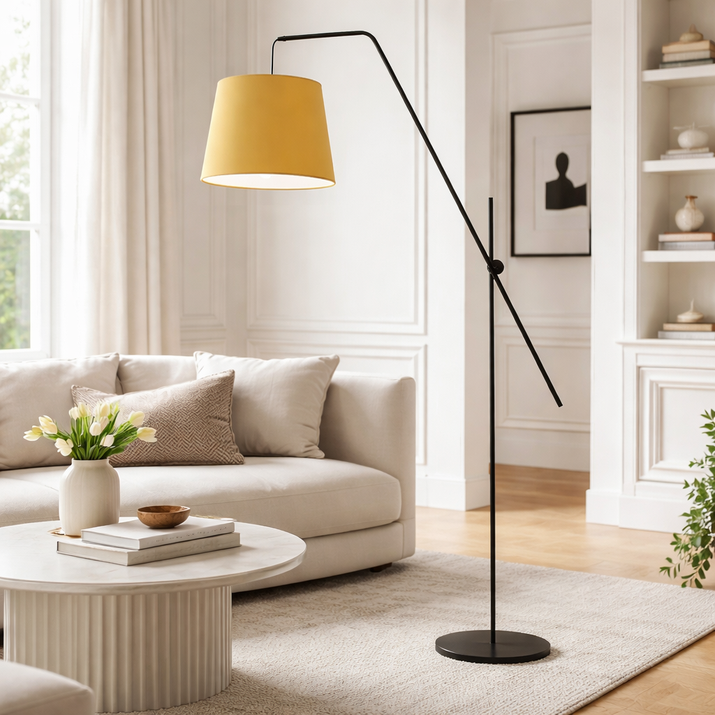 Czarna lampa stojąca do salonu na ruchomym ramieniu VIGO z abażurem musztardowym