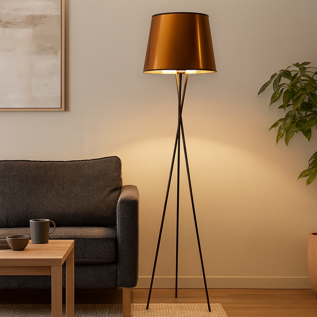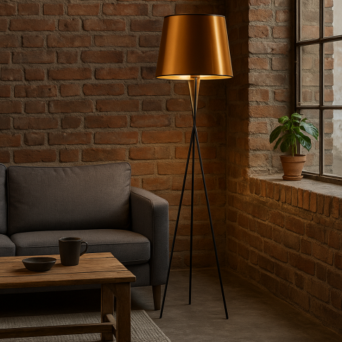 Lampa podłogowa na trzech nogach TOKIO z rodziny MIRROR utrzymana jest w minimalistycznym stylu łączącym elegancję i ponadczasowość. Na smukłym, czarnym trójnogu króluje lustrzany abażur dostępny w dwóch wariantach kolorystycznych złotym lub miedzianym. Wiązki światła wydobywające się spod designerskiego klosza – ocieplają pomieszczenie i powodują, że atmosfera staje się bardziej łagodna i relaksująca. Abażur w kształcie stożka idealnie pasuje do aranżacji wnętrz w których panuje elegancja i minimalistyczne rozwiązania. Lampa stojąca do salonu jest uniwersalnych rozmiarów (wysokość - 165 cm, szerokość - 37 cm), które pozwalają na umieszczenie jej zarówno w większych jak i mniejszych pomieszczeniach.