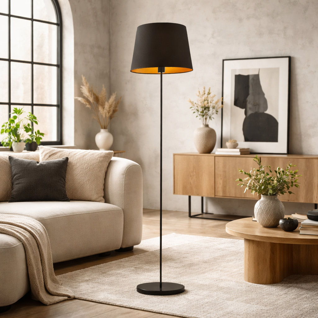 Czarna lampa stojąca podłogowa do salonu VASTO GOLD z czarnym abażurem ze złotym wnętrzem