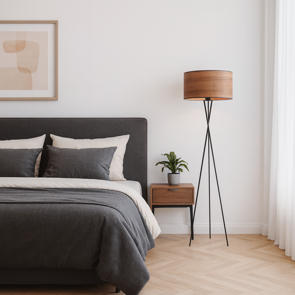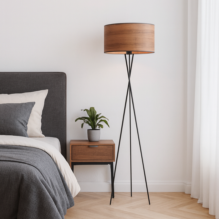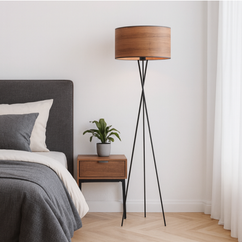 Podłogowa lampa stojąca na trójnogu PARYŻ z rodziny ECO utrzymana jest w minimalistycznym stylu łączącym elegancję i ponadczasowość. Na smukłym trójnogu dostępnym w 3 kolorach (białym, srebrnym lub czarnym) umieszczony został fornirowy abażur o średnicy 40 cm występujący aż w 3 wariantach kolorystycznych drewna (orzechowy, dąb sonoma oraz kasztanowy).