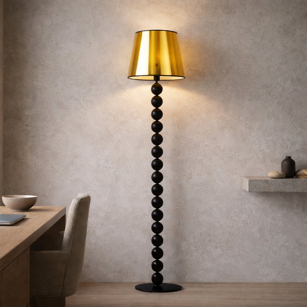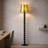 Czarno-miedziana lampa stojąca do salonu ze złotym abażurem