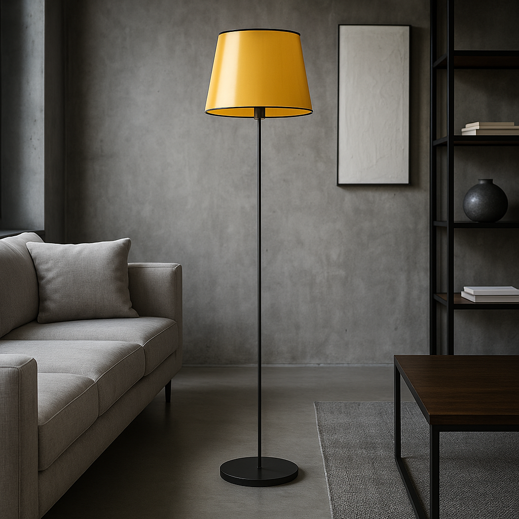 Lampa stojąca ze złotym abażurem VASTO MIRROR sprawi, że Twoje wnętrze stanie się bardziej przytulne a jego klimat sprzyjać będzie codziennemu wypoczynkowi i relaksowi. Lampa podłogowa z kolekcji polskiego producenta oświetlenia LYSNE.PL wykorzystując swoją mobilność staje się niezwykle praktyczną propozycją oświetlenia podłogowego. Jej smukła forma i średniej wielkości gabaryty pozwalają przestawiać ją w miejsce, gdzie dodatkowe źródło światło jest nam aktualnie potrzebne. Oświetlenie przypodłogowe składa się z czarnej, metalowej nóżki i designerskiego abażura w kształcie stożka. Wyjątkowy abażur o wymiarach 28 cm wysokości, 28 cm szerokości (górna średnica) i 37 cm (dolna średnica) dostępny jest w 2 wariantach złotym i miedzianym. Klosz lampy poza ciekawą kolorystyką posiada również połyskującą fakturę, która przypomina powierzchnię lustra odbijającą światło. Te dwie główne cechy nowoczesnego oświetlenia świetnie ze sobą współgrają tworząc ujmujące połączenie funkcjonalności i designu. Ten model stojącej abażurowej lampy podłogowej bez problemu wkomponuje się w modne pomieszczenia mieszkalne a także wnętrza lokali użytkowych np. hoteli, pensjonatów czy restauracji.