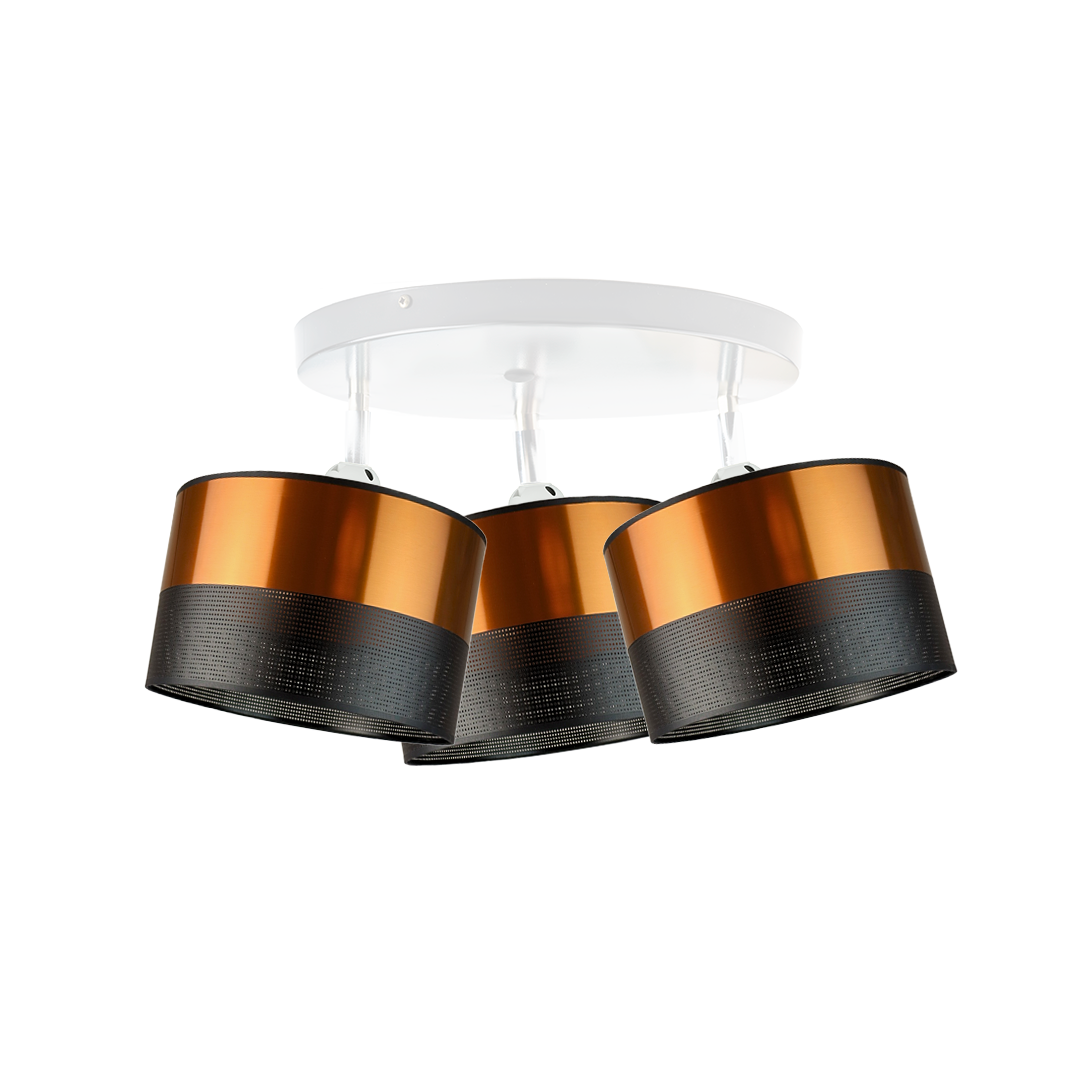 Nowoczesny plafon sufitowy DAKOTA GLAM to elegancka i funkcjonalna propozycja oświetlenia wewnętrznego, która idealnie komponuje się zarówno z glamour jak i loftowymi aranżacjami wnętrz. Jego wyrazista forma oraz efektowne połączenie materiałów sprawiają, że stanowi nie tylko praktyczne źródło światła, ale także wyjątkowy element dekoracyjny. Ten model plafonu sufitowego składa się z trzech abażurów umieszczonych na ruchomych przegubach, co pozwala na precyzyjne dostosowanie kąta padania światła. Okrągła podsufitka o średnicy 30 cm stabilnie podtrzymuje całą konstrukcję nadając lampie harmonijny wygląd. Wysokiej jakości cylindryczne klosze z dwukolorowego materiału PVC subtelnie rozpraszają światło wprowadzając do wnętrza przytulny klimat.