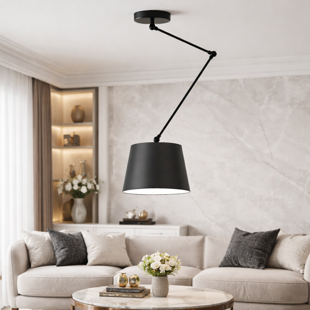 Lampa sufitowa na ruchomym wysięgniku JUMA wprowadza nowoczesny design nawet do wnętrza urządzonego w klasyczny sposób. Zastosowanie takich innowacyjnych dodatków do własnego mieszkania jest ciekawą propozycją stosowaną przez wielu projektantów. W ten sposób przełamujemy dominujący, jeden styl w mieszkaniu i zyskujemy ciekawą alternatywę dla stonowanej klasyki. Warto także wspomnieć, że regulowana lampa sufitowa to funkcjonalne rozwiązanie, gdy zależy nam na oświetleniu wybranej części pokoju, np. kącika z książkami, stołu w kuchni czy toaletki w sypialni.