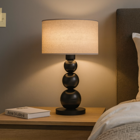 Designerska lampka nocna z abażurem HONOLULU ECO z pewnością spełni Twoje oczekiwania, jeżeli szukasz funkcjonalnego i eleganckiego oświetlenia na stolik nocny w sypialni, komodę w sypialni czy dodatkowe źródło światła do pokoju dziecka. Tak naprawdę tylko od Ciebie zależy w jaki sposób wykorzystasz jej potencjał. Elegancka forma i perfekcyjne wykonanie – to najważniejsze cechy designerskiej lampy stołowej HONOLULU ECO. Uwagę przykuwa konstrukcja oprawy, którą zdobią 3 kule ułożone w kolejności od największej do najmniejszej. Nietuzinkową podstawę lampy wieńczy abażur o średnicy 30 cm strukturą imitujący naturalne drewniane słoje. Cylindryczny klosz à la fornir (materiał PVC) zapewnia odpowiednie rozproszenie światła, idealne do czytania czy pracy przy komputerze. Czarna lampa stołowa z orzechowym kloszem o wysokości 41 cm i szerokości 30 cm jest doskonałym rozwiązaniem zarówno dla większych, jak i mniejszych mebli. Jej smukła forma i kompaktowe wymiary sprawiają, że idealnie sprawdzi się na powierzchniach, gdzie potrzebujesz dodatkowego oświetlenia.