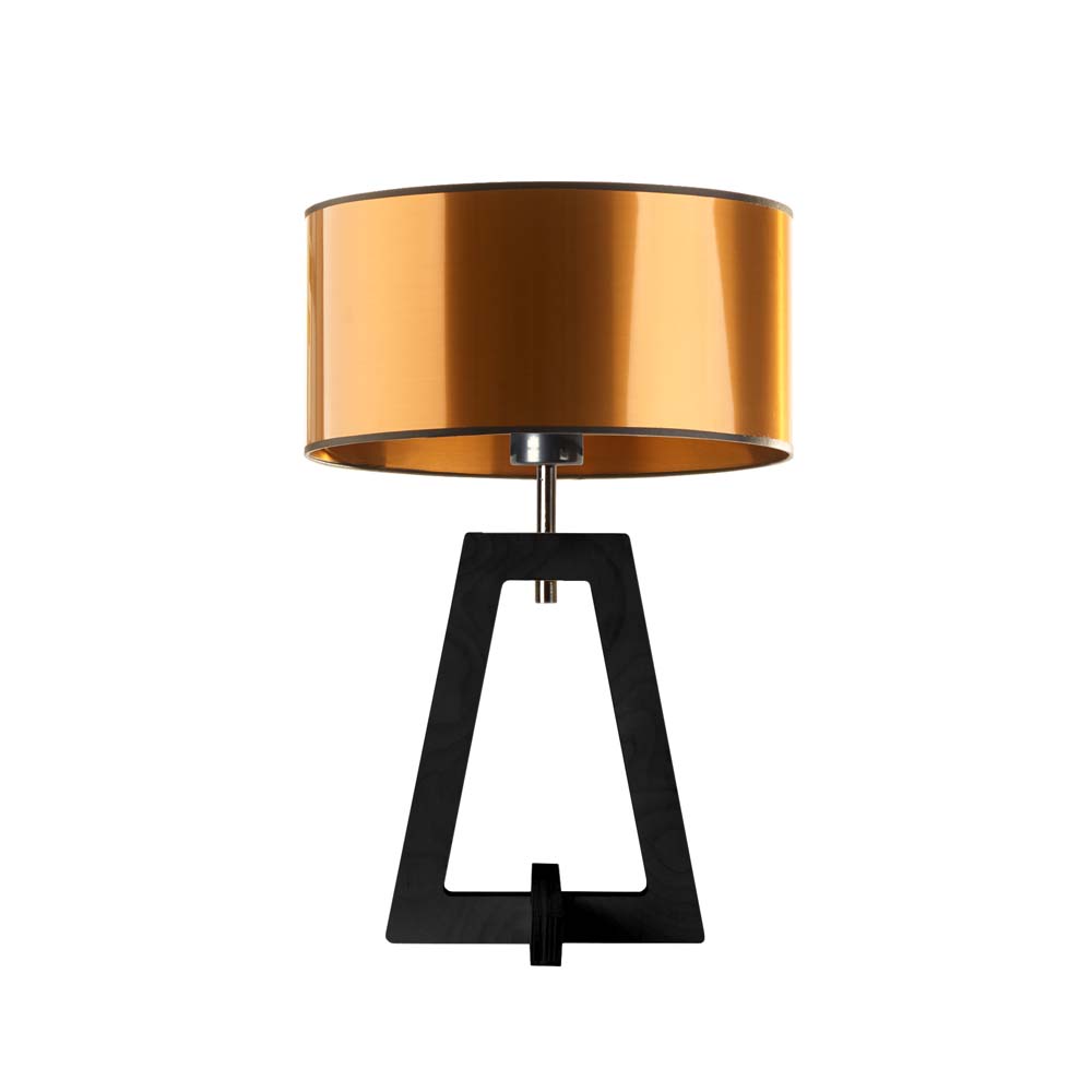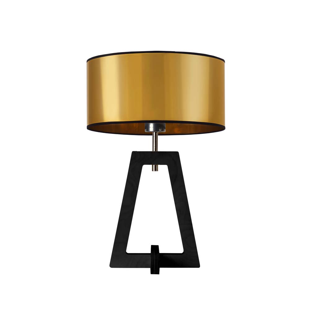Niecodzienny design drewnianej lampy stołowej CLIO MIRROR tkwi przede wszystkim w kolorystyce abażura o średnicy 30 cm, który dostępny jest w ciepłych odcieniach złota lub miedzi. Wybór tych kolorów nie jest przypadkowy, oba te odcienie doskonale wpisują się w najnowsze trendy wnętrzarskie. Uwagę przyciąga połyskująca folia klosza, która spektakularnie manipuluje światłem. Tworzy przyjemny, ciepły blask. Ta niezwykła cecha sprawia, że światło rozchodzi się w pomieszczeniu w unikalny sposób, kreując wyjątkową atmosferę. Kontrastowe wykończenie abażuru czarną oblamówką dodatkowo podkreśla jego ekskluzywny charakter, tworząc wyrafinowany detal, który wzbogaci całość kompozycji. Obok lampy stołowej z drewnianą podstawą z pewnością nikt nie przejdzie obojętnie również ze względu na jej foremny stelaż. Hebanowa podstawa oprawy składa się z dwóch nóg zbiegających się ku górze, tworząc zamkniętą formę trapezu. Krzyż z drewnianych listew na podłożu zapewnia jej stabilną pozycję i nowoczesny design.