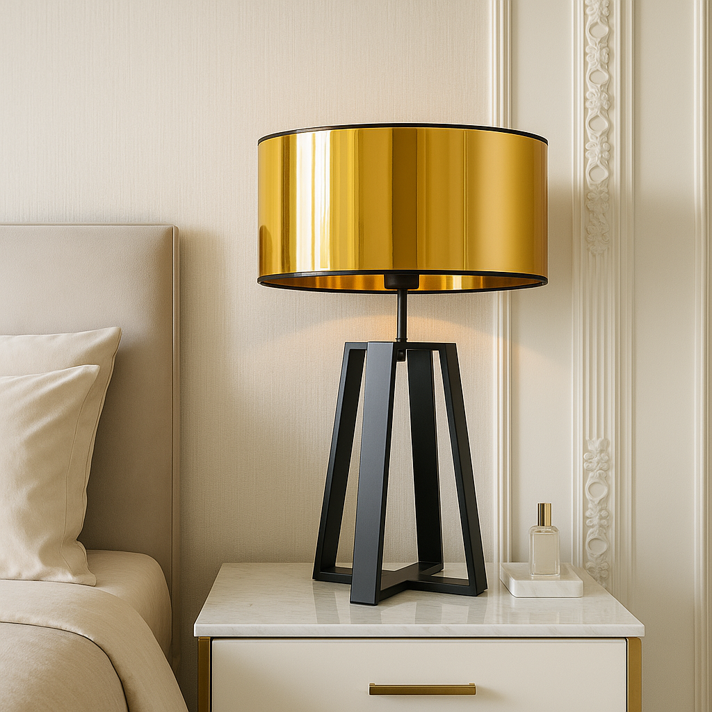 Elegancka lampka stołowa THOR należy do serii MIRROR zaprojektowanej przez polskiego producenta oświetlenia LYSNE.PL. Podstawa oprawy THOR składa się z czterech, płaskich nóg zbiegających się ku górze tworzących formę trapezu. Krzyż na podłożu lampy połączony z płaskimi nogami zapewnia nie tylko stabilną postawę ale także podkreśla jej minimalistyczny charakter. Lampę stołową glamour THOR MIRROR koronuje cylindryczny abażur wykonany z półprzeźroczystej folii PVC w kolorze złota. Dla kontrastu klosz o średnicy 40 cm wykończony jest czarną lamówką, która idealnie pasować będzie do mebli i dodatków stylu glamour. Abażur posiada jeszcze jedną cechę – jego powierzchnia jest całkowicie gładka a to przekłada się na rewelacyjne odbijanie przez nią światła. W efekcie na powierzchni klosza możemy się przejrzeć niczym w lustrze. Promień światła wydobywający się spod designerskiego abażura jest przytłumiony, dzięki czemu w świetle lampy stołowej do salonu THOR można się łatwo zrelaksować i poczuć niezwykle komfortowo. Ten model oprawy oświetleniowej sprawdzi się świetnie jako wieczorne oświetlenie w salonie ale także nada się do oświetlenia szafki nocnej w sypialni.