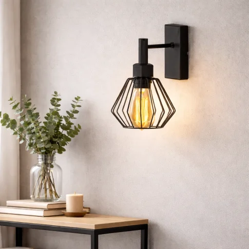 Minimalistyczny prostokątny stelaż w białym lub czarnym kolorze doskonale współgra z drucianym kloszem dostępnym w 2 wariantach kolorystycznych: białym oraz czarnym. Model wyposażony jest w klosz w kształcie diamentu o standardowym dla kinkietów rozmiarze, czyli 13 cm wysokości oraz 16,5 cm szerokości. Cała lampa natomiast jest wysoka na 27,5 cm oraz szeroka na 23 cm. Dzięki temu, że klosz wraz z żarówką skierowany jest w dół, oprawa może pełnić funkcję kinkietu do czytania. Rozproszone światło nie będzie razić w oczy po wstaniu z łóżka, ale za to czytając z pozycji leżącej, światło znad głowy świetnie oświetli strony czytanej książki.