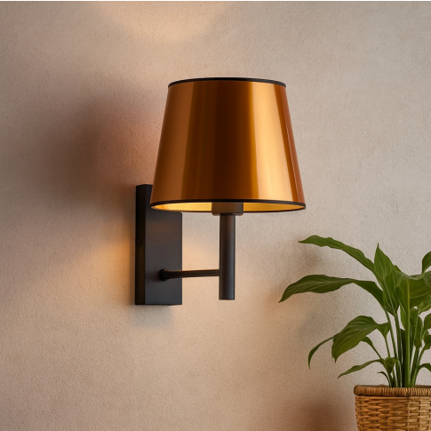 Model IZMIR MIRROR wyposażony jest w efektowny abażur dostępny w dwóch modnych wariantach kolorystycznych: miedzianym oraz złotym. Stożkowy klosz o wymiarach: wysokość 14 cm, średnica górna 15 cm i dolna 19,5 cm w połączeniu z czarnym metalowym stelażem tworzy spójną i elegancką całość. Dzięki temu lampa może pełnić rolę zarówno kinkietu ściennego nowoczesnego jak i stylowego dodatku w aranżacjach loft, vintage czy industrialnych. Całkowite wymiary lampy (27 cm wysokości i 24 cm szerokości) sprawiają, że jest to również praktyczny kinkiet ścienny podłużny, który efektownie prezentuje się na ścianie.