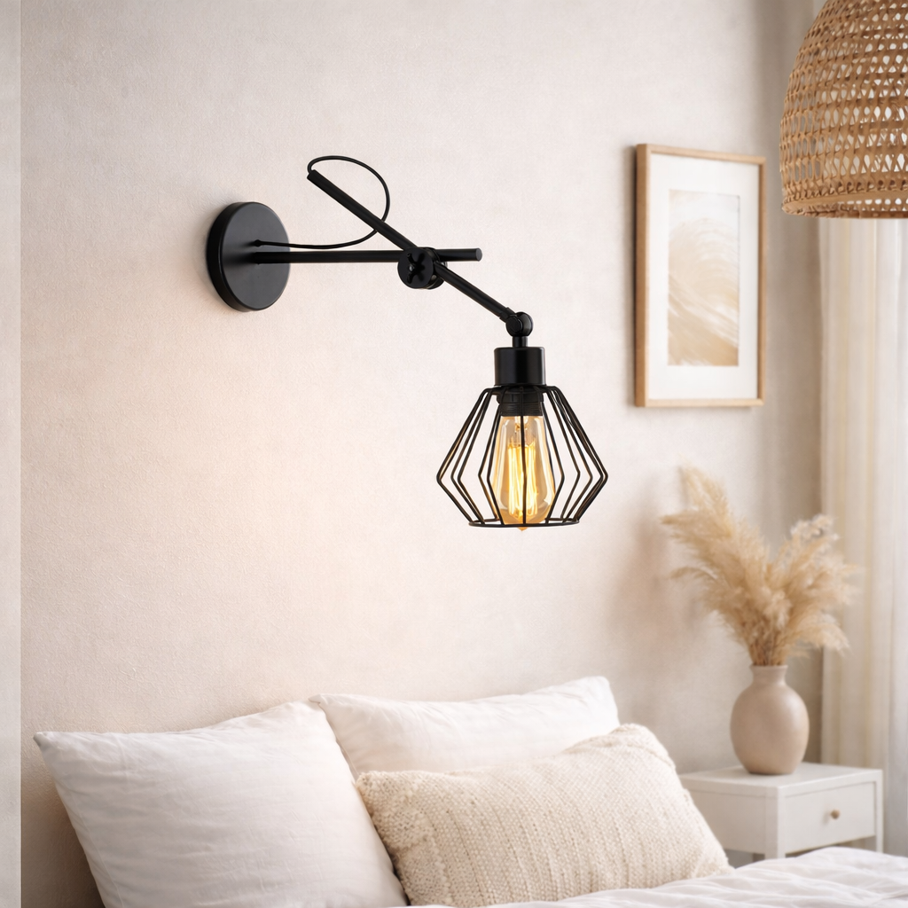 Czarny kinkiet z regulowanym ramieniem DORADO z kolekcji LOFT to prawdziwy bestseller wśród opraw świetlnych pasujących do wnętrz industrialnych. Model kinkietu przyciąga uwagę i zachwyca nie tylko surowym pięknem, ale również szerokim zastosowaniem. Ten stylowy i niekonwencjonalny kinkiet ścienny regulowany świetnie sprawdzi się jako oświetlenie domowego gabinetu z biblioteczką, pokoju gościnnego czy salonu. Na funkcjonalną konstrukcję loftowej lampy ściennej DORADO składa się owalna podstawa, niecodzienny stelaż złożony z dwóch prostych elementów i kablowego łączenia oraz druciany klosz w kształcie diamentu z możliwością regulacji kąta padania światła.