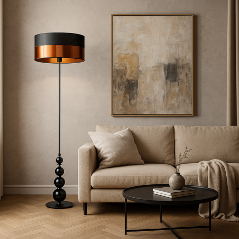 Nowoczesna lampa podłogowa ROMA GLAM to połączenie klasycznej formy z nowoczesną elegancją, które odmienia każde wnętrze. Smukły, metalowy stelaż, dostępny w kolorze białym, srebrnym lub czarnym został wzbogacony o 4 dekoracyjne kule o różnej średnicy, harmonijnie rozmieszczone przy podstawie lampy – od największej do najmniejszej. Całość wieńczy abażur w kształcie walca o szerokości 40 cm i wysokości 20 cm. Dla miłośników luksusowych detali przygotowano wyjątkowe warianty abażurów: czarny z czarnym ażurem, czarny ze złotym wnętrzem z czarnym ażurem, biały ze złotym wnętrzem z ażurem, miedziany, srebrny oraz złoty – wszystkie wykończone subtelnym, dekoracyjnym ażurem. Wysokość eleganckiej lampy stojącej do salonu wynosi 166 cm, co pozwala wprowadzić efektowny element aranżacyjny do przestronnych i mniejszych wnętrz.