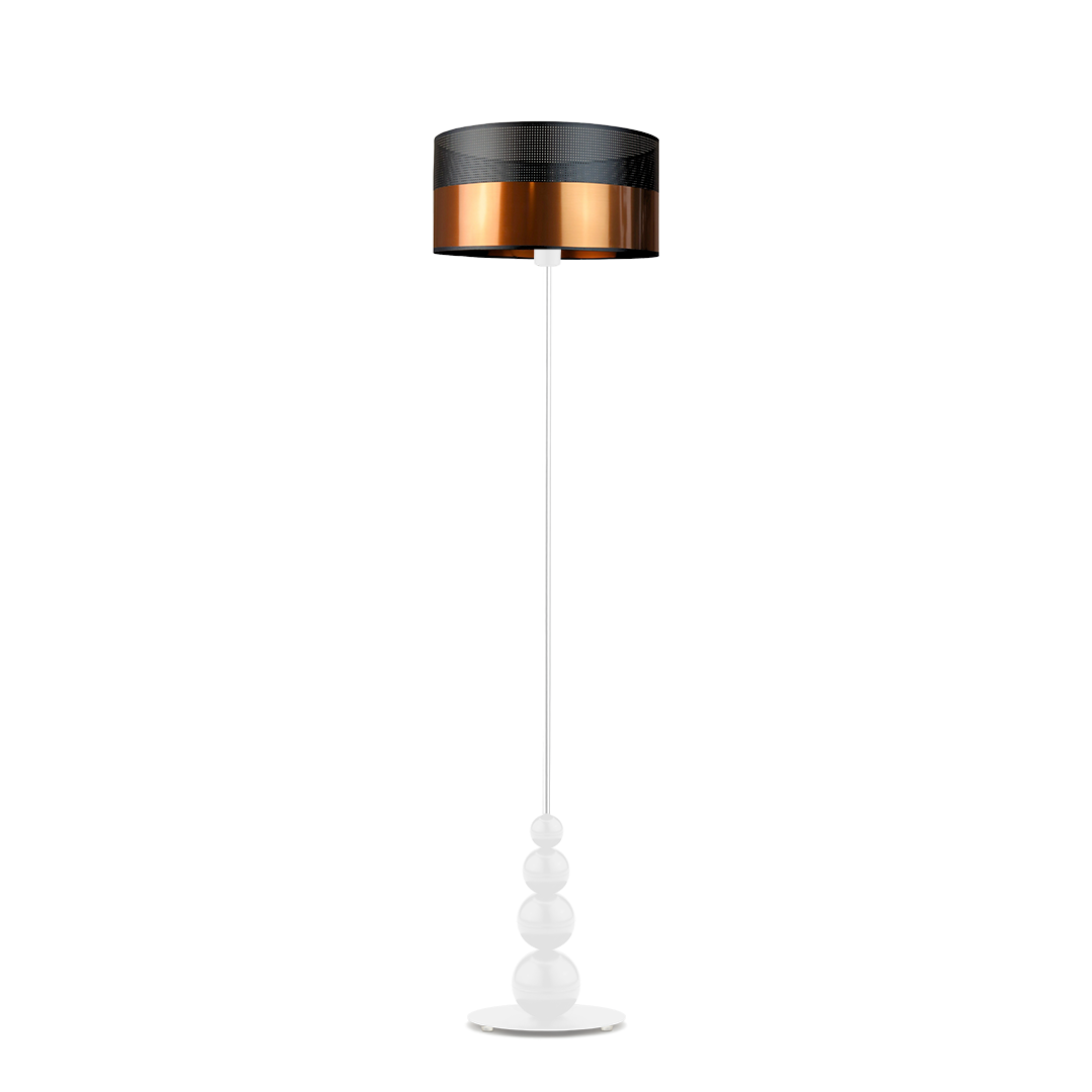 Nowoczesna lampa podłogowa ROMA GLAM to połączenie klasycznej formy z nowoczesną elegancją, które odmienia każde wnętrze. Smukły, metalowy stelaż, dostępny w kolorze białym, srebrnym lub czarnym został wzbogacony o 4 dekoracyjne kule o różnej średnicy, harmonijnie rozmieszczone przy podstawie lampy – od największej do najmniejszej. Całość wieńczy abażur w kształcie walca o szerokości 40 cm i wysokości 20 cm. Dla miłośników luksusowych detali przygotowano wyjątkowe warianty abażurów: czarny z czarnym ażurem, czarny ze złotym wnętrzem z czarnym ażurem, biały ze złotym wnętrzem z ażurem, miedziany, srebrny oraz złoty – wszystkie wykończone subtelnym, dekoracyjnym ażurem. Wysokość eleganckiej lampy stojącej do salonu wynosi 166 cm, co pozwala wprowadzić efektowny element aranżacyjny do przestronnych i mniejszych wnętrz.