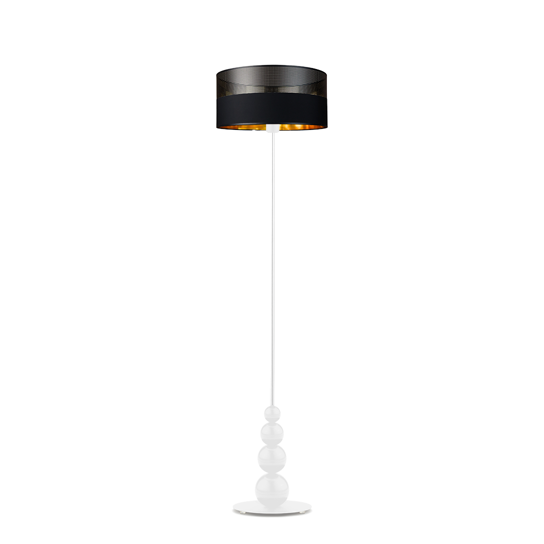 Nowoczesna lampa podłogowa ROMA GLAM to połączenie klasycznej formy z nowoczesną elegancją, które odmienia każde wnętrze. Smukły, metalowy stelaż, dostępny w kolorze białym, srebrnym lub czarnym został wzbogacony o 4 dekoracyjne kule o różnej średnicy, harmonijnie rozmieszczone przy podstawie lampy – od największej do najmniejszej. Całość wieńczy abażur w kształcie walca o szerokości 40 cm i wysokości 20 cm. Dla miłośników luksusowych detali przygotowano wyjątkowe warianty abażurów: czarny z czarnym ażurem, czarny ze złotym wnętrzem z czarnym ażurem, biały ze złotym wnętrzem z ażurem, miedziany, srebrny oraz złoty – wszystkie wykończone subtelnym, dekoracyjnym ażurem. Wysokość eleganckiej lampy stojącej do salonu wynosi 166 cm, co pozwala wprowadzić efektowny element aranżacyjny do przestronnych i mniejszych wnętrz.