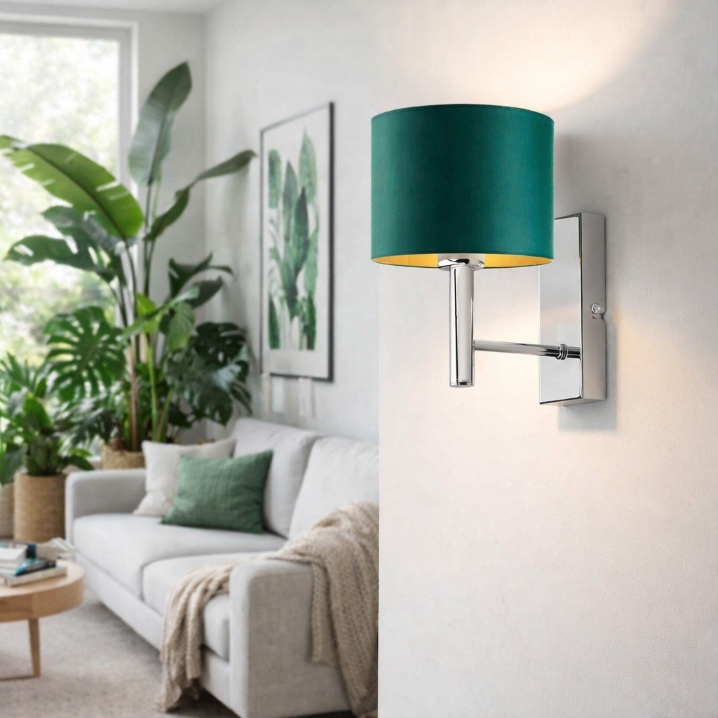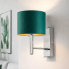 Kinkiet TEGU GOLD to stylowy i dekoracyjny kinkiet z abażurem, który łączy w sobie elegancję stylu glamour z estetyką nowoczesnych kinkietów ściennych. Charakterystyczny, cylindryczny abażur wykonany z wysokiej jakości tkaniny subtelnie rozprasza światło tworząc przyjemną atmosferę w pomieszczeniu. Złote wnętrze abażuru ociepla barwę światła, dzięki czemu kinkiet z abażurem w kolorze zieleni butelkowej doskonale sprawdzi się jako nastrojowe oświetlenie ścienne w salonie, sypialni oraz pokoju dziennym. Geometryczny metalowy stelaż nadaje lampie elegancki charakter, dzięki czemu model ten idealnie wpisuje się w aranżacje w stylu nowoczesnym, minimalistycznym, klasycznym oraz glamour.