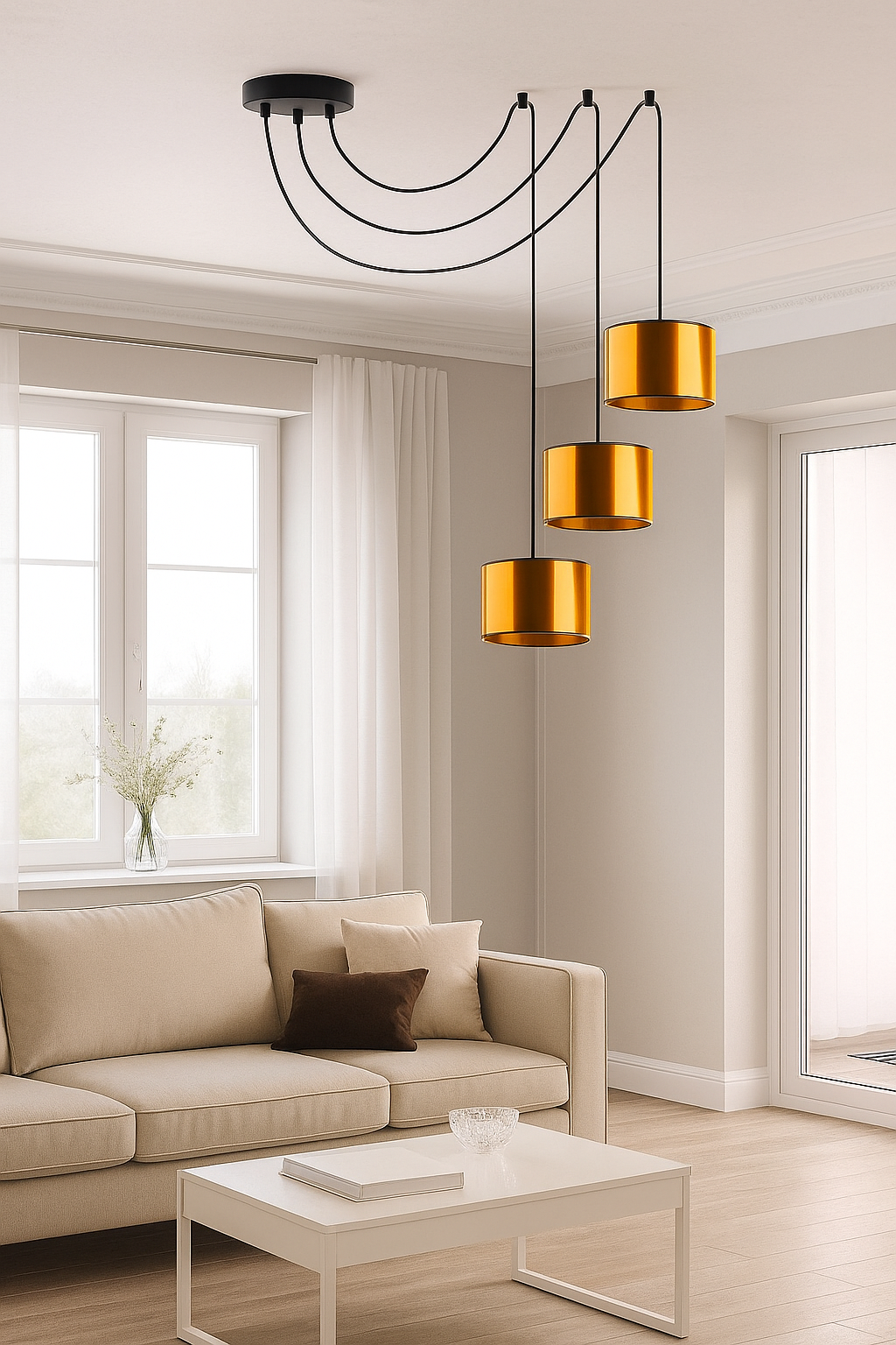 Model lampy wiszącej typu pająk WAIKIKI W3 MIRROR wyróżniają trzy abażury o średnicy 17,5 cm i wysokości 12 cm – proste, cylindryczne, ale niepozbawione charakteru. Ich błyszczące, złote lub miedziane wykończenie doskonale kontrastuje z czarnym stelażem, tworząc ponadczasowe połączenie, które pasuje zarówno do wnętrz glamour jak i industrialnych. Subtelne światło żarówek delikatnie przebija przez materiał abażurów tworząc przyjemny, nastrojowy efekt. To idealna propozycja dla osób, które cenią detale i chcą, by ich oświetlenie nie tylko spełniało funkcję użytkową, ale również stanowiło efektowny element dekoracyjny.