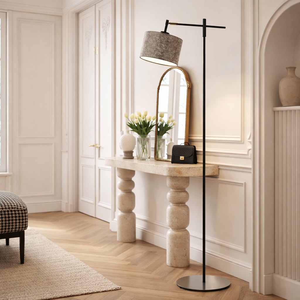 Jesteś wierny zasadzie, że mniej to znaczy więcej? Lubisz meble i dodatki oszczędne w formie, bez wielkich ozdób? Cenisz oświetlenie o minimalistycznym wyglądzie? To właśnie z myślą o takich klientach stworzyliśmy lampę podłogową z regulowanym ramieniem SERES. To oświetlenie podłogowe jest uniwersalnym i funkcjonalnym rozwiązaniem do każdego pokoju, biura czy lokalu usługowego. Minimalistyczna lampa podłogowa SERES składa się z prostego stelaża, na którym prostopadle zawieszone jest ramię zakończone owalnym abażurem o średnicy 17,5 cm. Klosz został wykonany z holenderskiej tkaniny tekstylnej, natomiast konstrukcja jest metalowa. Lampa podłogowa posiada okrągłą, stabilną podstawę, a jej całkowita wysokość wynosi 145 cm. Model SERES jest oświetleniem podłogowym o kompaktowych wymiarach, dlatego pasuje do wielu, nawet małych wnętrz. Polski producent lamp LYSNE.PL oferuje stelaż w trzech barwach. Natomiast klosz dostępny jest aż w 20 wariantach kolorystycznych. Do lampy stojącej SERES pasuje żarówka o gwincie E27 o klasach energetycznych od A do G oraz żarówka LED mocowana na tzw. duży gwint E27.