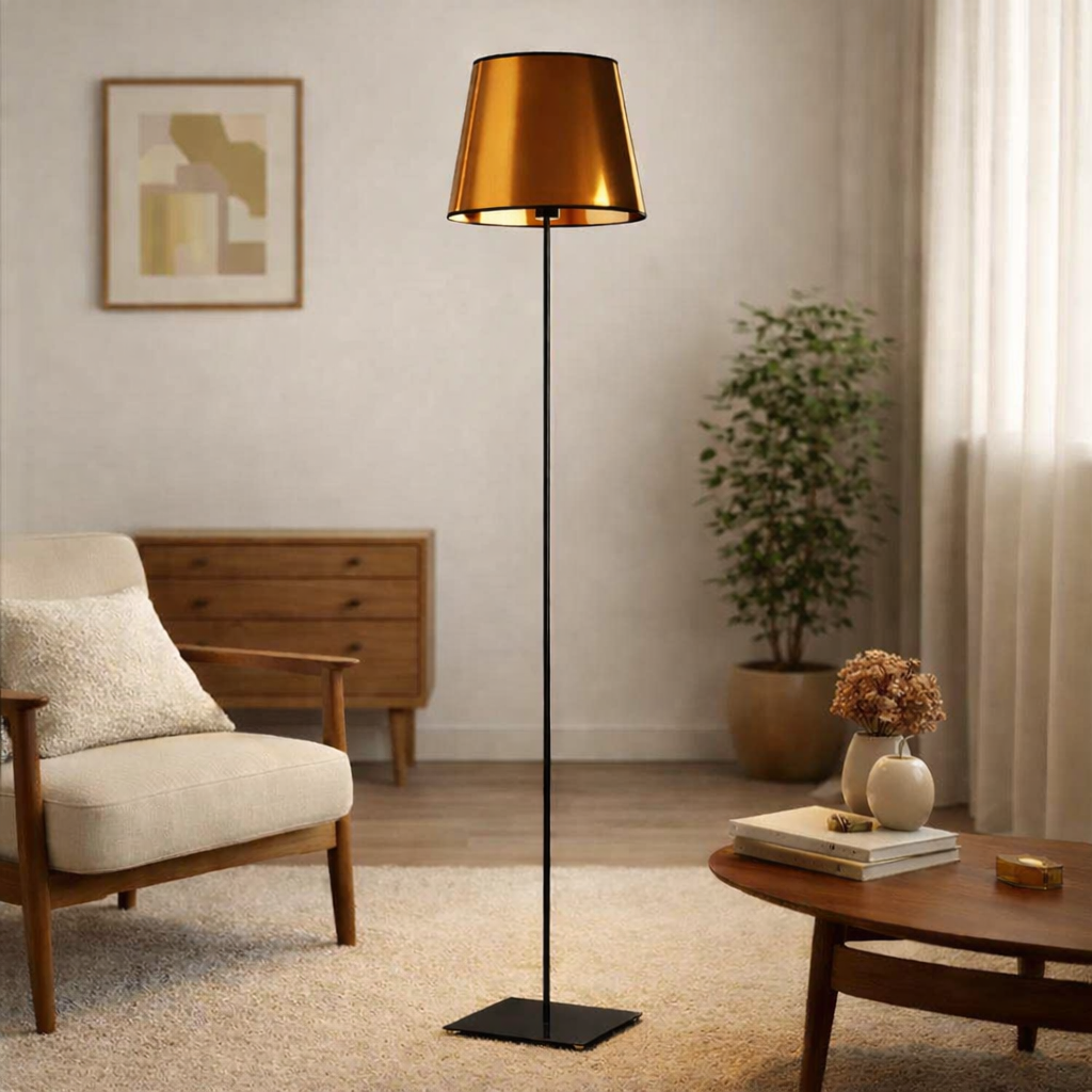 Czarna lampa stojąca z miedzianym kloszem z łatwością wkomponuje się w nowoczesne wnętrza glamour ale także harmonizować będzie z przestrzeniami urządzonymi w nieco nowocześniejszym, np. nowojorskim stylu. Abażur lampy wykonano z lustrzanego materiału PVC w kolorze złotym lub miedzianym – do wyboru. Stojąca lampa podłogowa poprzez swoją ciepłą kolorystykę klosza zabiera nas do słonecznego klimatu, w którym uczucie relaksu i błogi nastrój jest niezwykle łatwy do osiągnięcia. Wysokość lampy wynosi 162,5 cm, a jej szerokość to 37 cm – idealne proporcje, które wspaniale uzupełnią każde wnętrze.