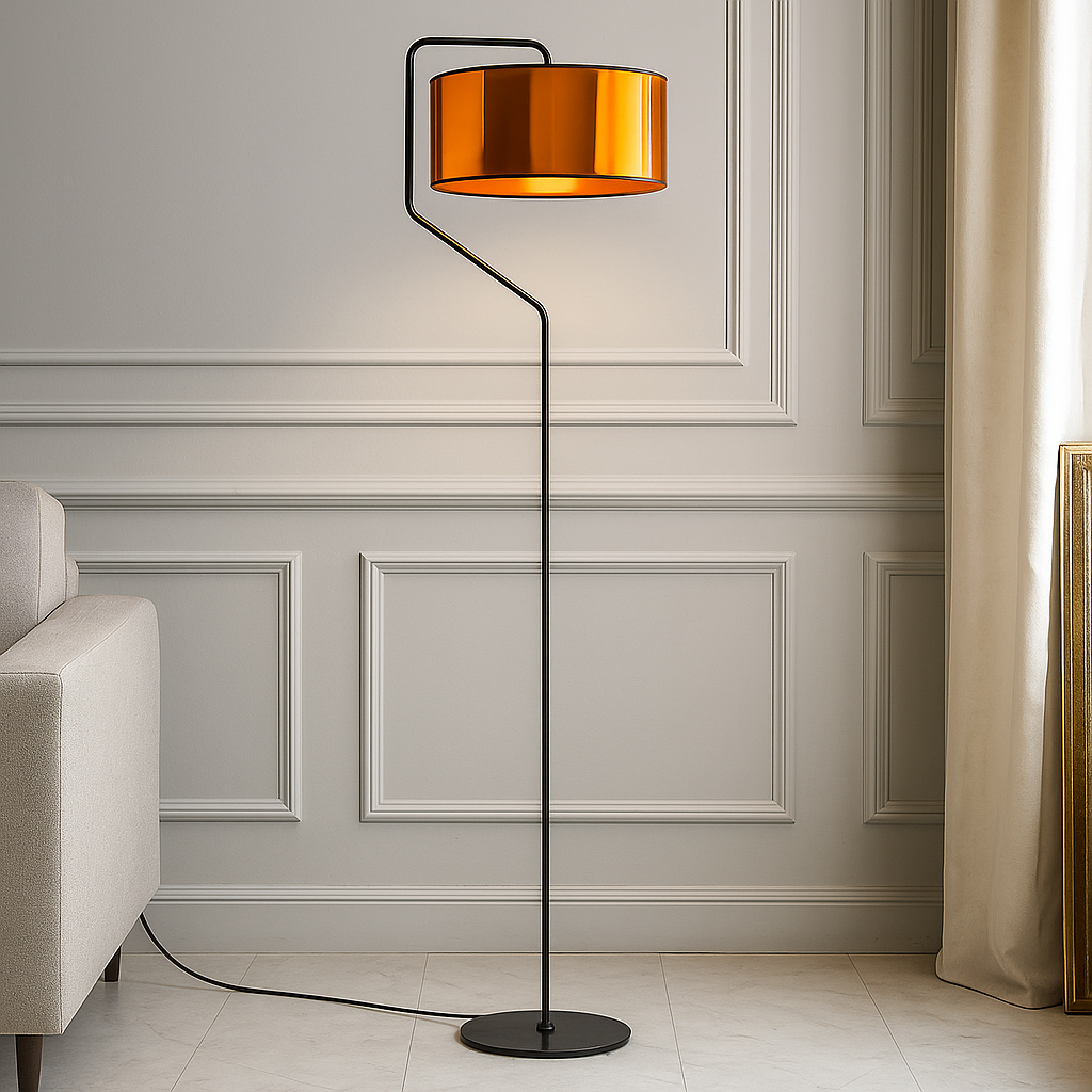 Czarno-miedziana lampa podłogowa TESALLIA MIRROR to elegancka propozycja, która łączy nowoczesny design z luksusowymi akcentami. Wyposażona w abażur o lustrzanym wykończeniu, dostępny w dwóch stylowych kolorach — złotym i miedzianym. Ta industrialna lampa podłogowa doskonale wpisuje się w aranżacje, które potrzebują wyjątkowego akcentu oświetleniowego. Smukła, czarna podstawa lampy stojącej z zakrzywieniem w górnej części stanowi idealny kontrast dla błyszczącego abażura, tworząc harmonijną całość, która przyciąga wzrok i nadaje wnętrzu elegancji. Lampa podłogowa mierzy 156 cm wysokości i 40 cm szerokości, co czyni ją funkcjonalnym, ale jednocześnie dekoracyjnym elementem wystroju.