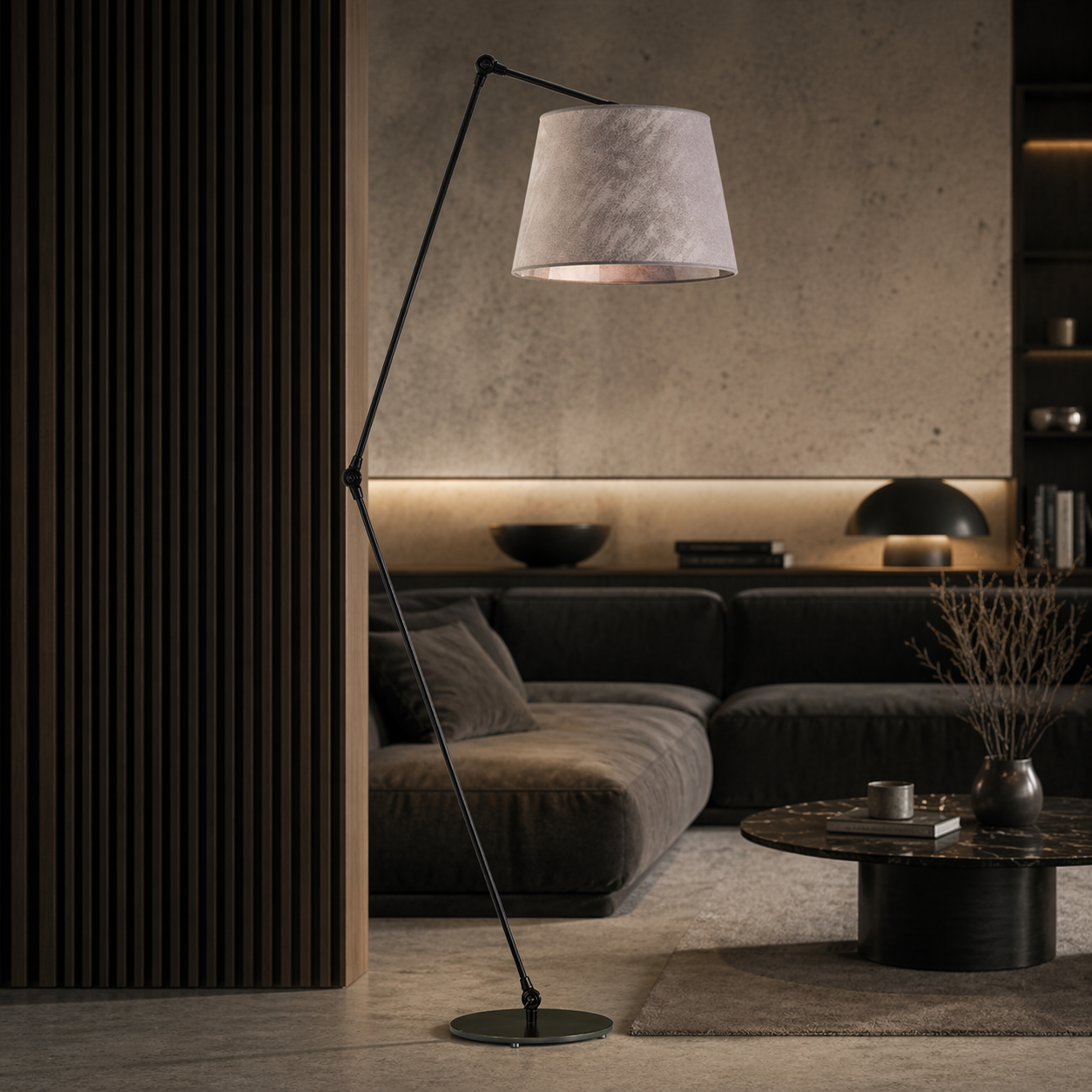 Uniwersalna konstrukcja, stożkowy abażur oraz ruchome ramię lampy stojącej czynią ją nie tylko funkcjonalnym źródłem światła, ale również elementem dekoracyjnym. Zastosowany przegub umożliwia precyzyjne ustawienie kierunku świecenia, a stabilna podstawa zapewnia bezpieczeństwo użytkowania. Dodatkowym atutem jest wygodny włącznik nożny umieszczony na przewodzie. Model ten doskonale komponuje się z innymi elementami oświetlenia, takimi jak kinkiet ścienny regulowany LUGO z dodatkowym panelem LED, lampka nocna SIENA oraz nowoczena lampa sufitowa TAMPA, tworząc spójną aranżację wnętrza.