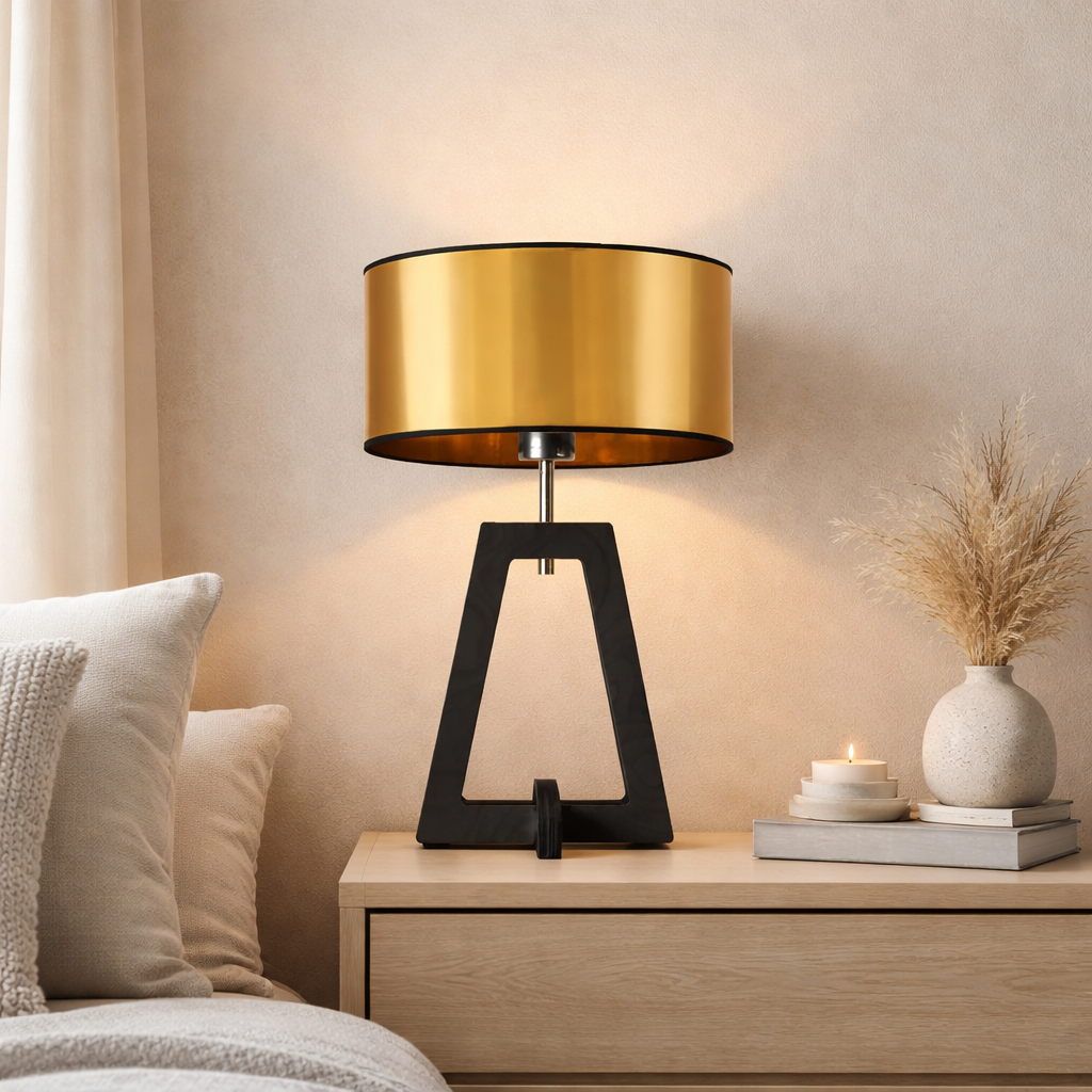 Niecodzienny design drewnianej lampy stołowej CLIO MIRROR tkwi przede wszystkim w kolorystyce abażura o średnicy 30 cm, który dostępny jest w ciepłych odcieniach złota lub miedzi. Wybór tych kolorów nie jest przypadkowy, oba te odcienie doskonale wpisują się w najnowsze trendy wnętrzarskie. Uwagę przyciąga połyskująca folia klosza, która spektakularnie manipuluje światłem. Tworzy przyjemny, ciepły blask. Ta niezwykła cecha sprawia, że światło rozchodzi się w pomieszczeniu w unikalny sposób, kreując wyjątkową atmosferę. Kontrastowe wykończenie abażuru czarną oblamówką dodatkowo podkreśla jego ekskluzywny charakter, tworząc wyrafinowany detal, który wzbogaci całość kompozycji. Obok lampy stołowej z drewnianą podstawą z pewnością nikt nie przejdzie obojętnie również ze względu na jej foremny stelaż. Hebanowa podstawa oprawy składa się z dwóch nóg zbiegających się ku górze, tworząc zamkniętą formę trapezu. Krzyż z drewnianych listew na podłożu zapewnia jej stabilną pozycję i nowoczesny design.