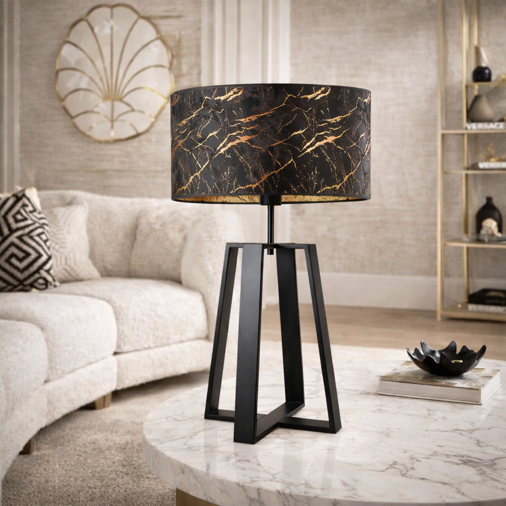 Cechą rozpoznawczą stojącej lampy stołowej jest ciekawa konstrukcja i designerski abażur. Rama lampy wygląda jak nachodzące na siebie trapezy a klosz wykonany jest z holenderskiej tkaniny tekstylnej o wzorze marmuru. Abażur z domieszką złotej nici z pewnością wyróżni się na tle innych dekoracji nadając wnętrzu głębi i charakteru. Lampa stołowa THOR pasuje idealnie do wielu wnętrz urządzonych w klasycznym ale i nowoczesnym stylu. Oprawa nadaje się szczególnie do domowych pomieszczeń i może być źródłem światła, które sprawi, że wnętrza staną się przytulniejsze. Dotyczy to nie tylko sypialni, ale również salonu, w których można zastosować materiałową lampę stołową jako oświetlenie dodatkowe. Blask światła wydobywający się spod marmurowego klosza ze złotymi akcentami wygląda ciepło a zarazem luksusowo.
