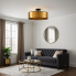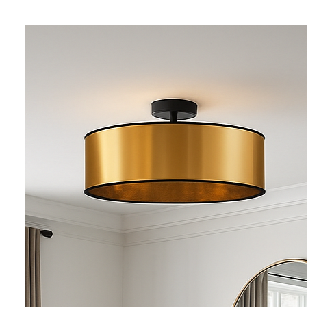 Złota lampa sufitowa WENECJA MIRROR w wersji klosza o średnicy 50 cm to wyjątkowo elegancka lampa sufitowa zaprojektowana z myślą o miłośnikach luksusowego stylu i nowoczesnej estetyki. Cylindryczny abażur wykonany z materiału PVC tworzy niezwykle efektowny złoty klosz, który subtelnie odbija światło i wzbogaca wnętrze o ciepły, nastrojowy blask. Czarna obręcz dodaje całości wyrazistości, dzięki czemu oprawa świetnie wpisuje się w koncepcję oświetlenia w stylu glamour. Przenikające przez abażur światło tworzy piękny efekt na suficie. To idealny wybór do przestrzeni w których liczy się jakość, elegancja oraz efekt wizualny.