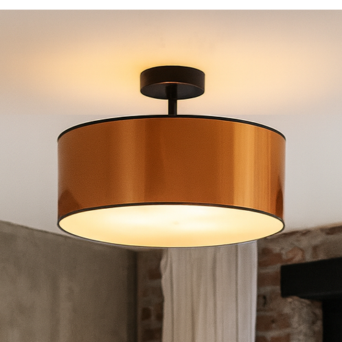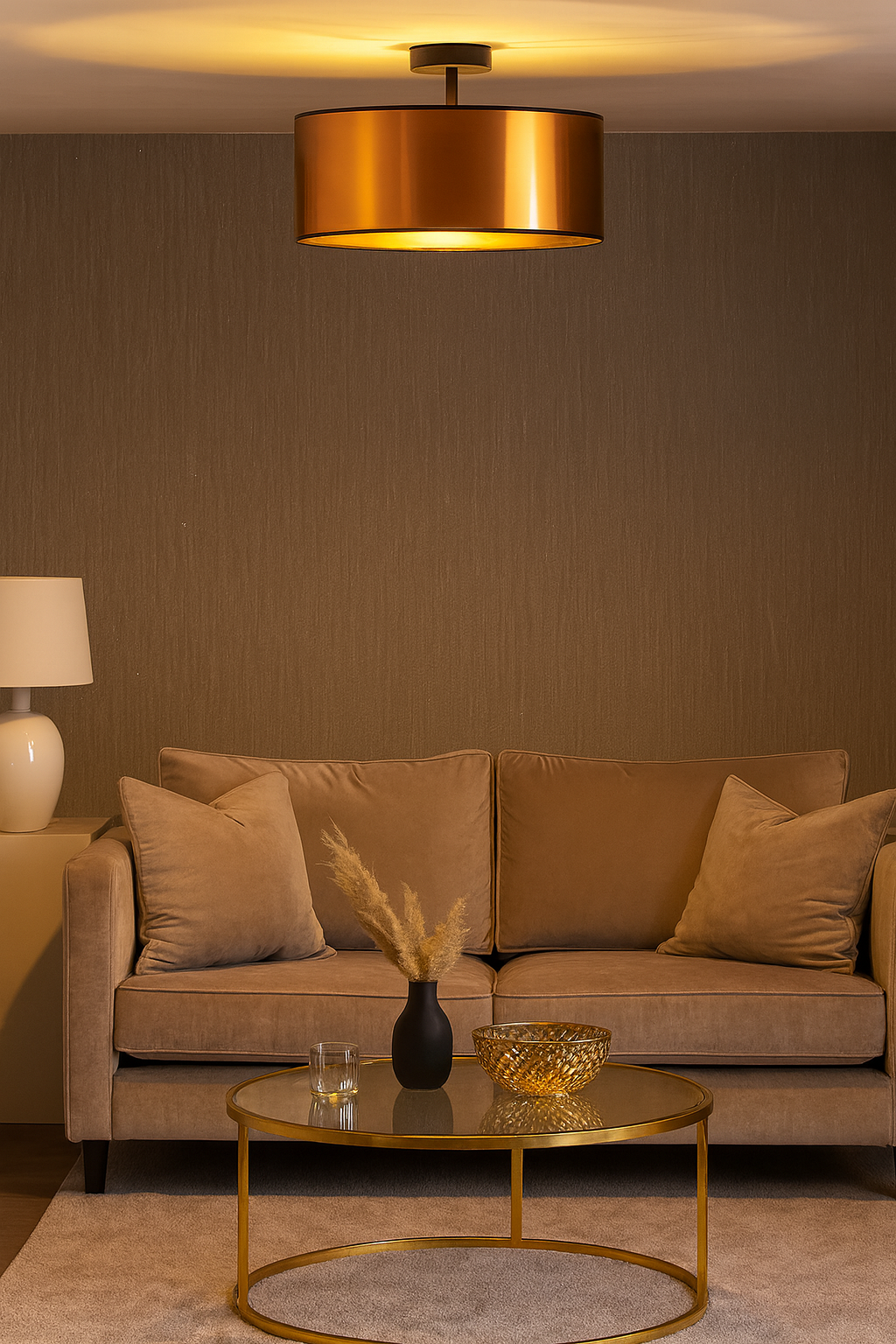 Nowoczesna lampa sufitowa z miedzianym abażurem WENECJA MIRROR to wyjątkowe oświetlenie glamour, łączące funkcjonalność i elegancki design. Wzrok przyciąga cylindryczny abażur o średnicy 40 cm wykonany z materiału PVC, który tworzy efektowny miedziany klosz wykończony czarną obwódką. Ciepły odcień abażura nadaje wnętrzu przyjemnego, nastrojowego klimatu, dzięki czemu ten designerski plafon idealnie podkreśla charakter nowoczesnych aranżacji. Delikatnie przenikające przez abażur światło eksponuje główny punkt świetlny tworząc subtelną, dekoracyjną poświatę. To wyjątkowo elegancka i designerska lampa sufitowa, która doskonale komponuje się z żarówkami ozdobnymi Edison, tworząc efektowne i stylowe oświetlenie we wnętrzu.