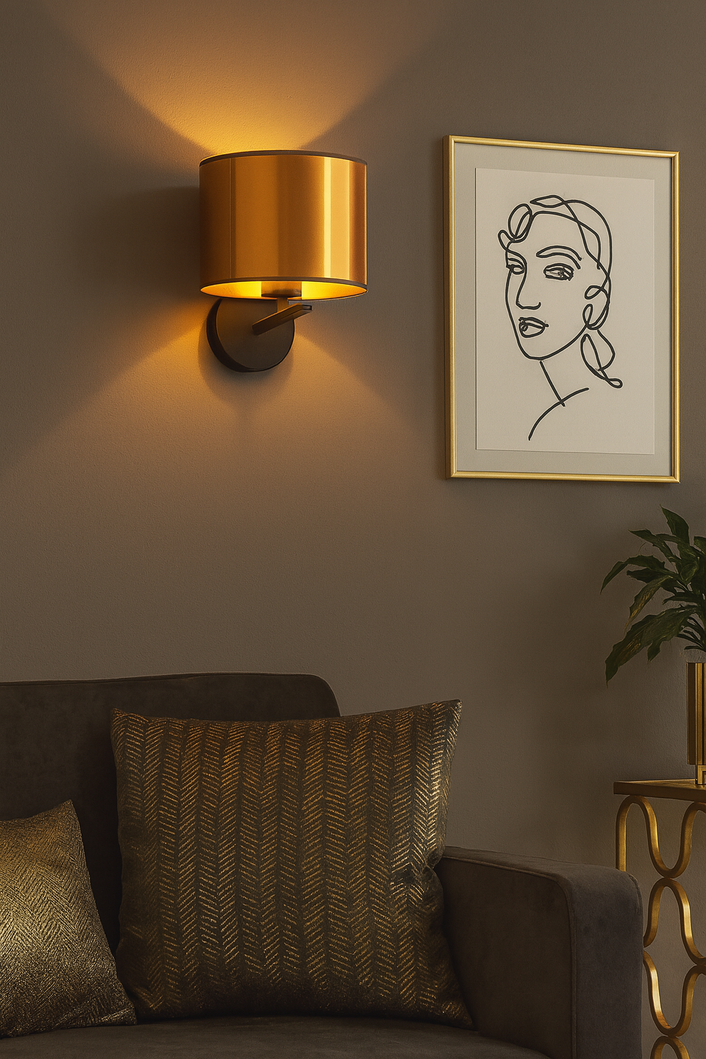 Złoty abażur – idealny do wnętrz glamour i nowoczesnych w których królują jasne barwy, marmur i lustrzane dodatki.