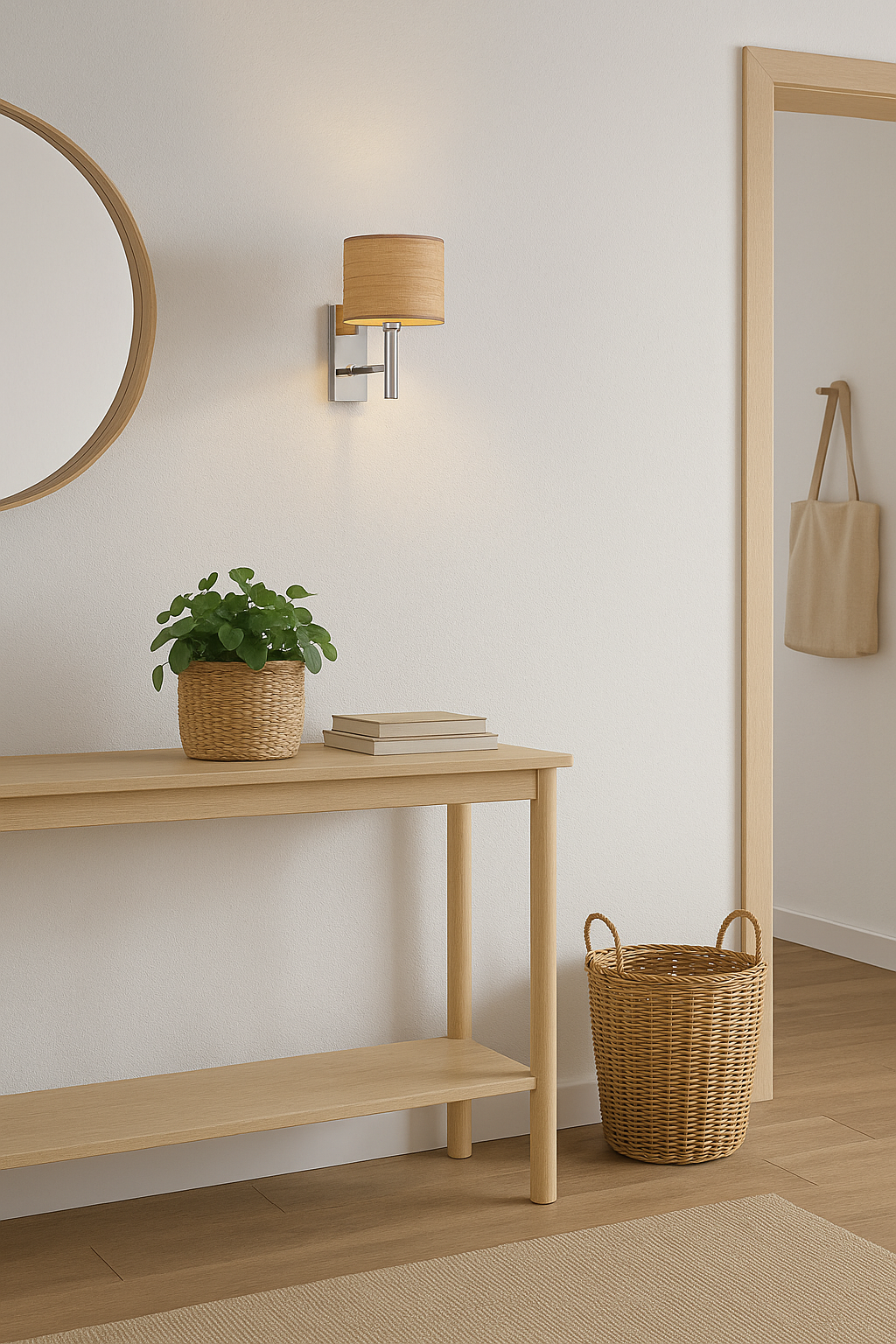 Prosta, metalowa konstrukcja łączy się tutaj z designerskim abażurem z PVC o strukturze forniru, co nadaje lampie lekkości, a jednocześnie gwarantuje trwałość. Kinkiet ścienny z abażurem TEGU ECO świetnie sprawdzi się jako nastrojowe oświetlenie w sypialni – ustawiony nad łóżkiem zapewni komfort przy wieczornej lekturze – ale równie dobrze odnajdzie się w salonie, gdzie podkreśli charakter wnętrza i stworzy kameralną atmosferę. To także znakomity wybór do przedpokoju czy korytarza, gdzie często brakuje dodatkowego źródła światła. Jeśli szukasz dekoracyjnego kinkiet ściennego, która łączy estetykę z funkcjonalnością, nowoczesny kinkiet ścienny z abażurem spełni te oczekiwania.